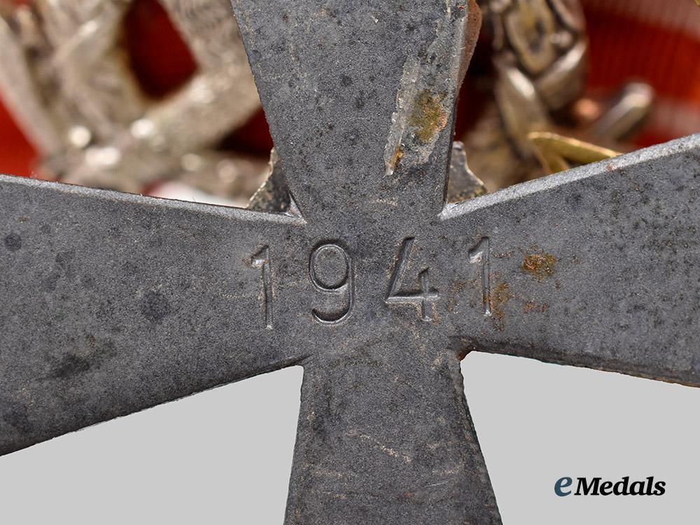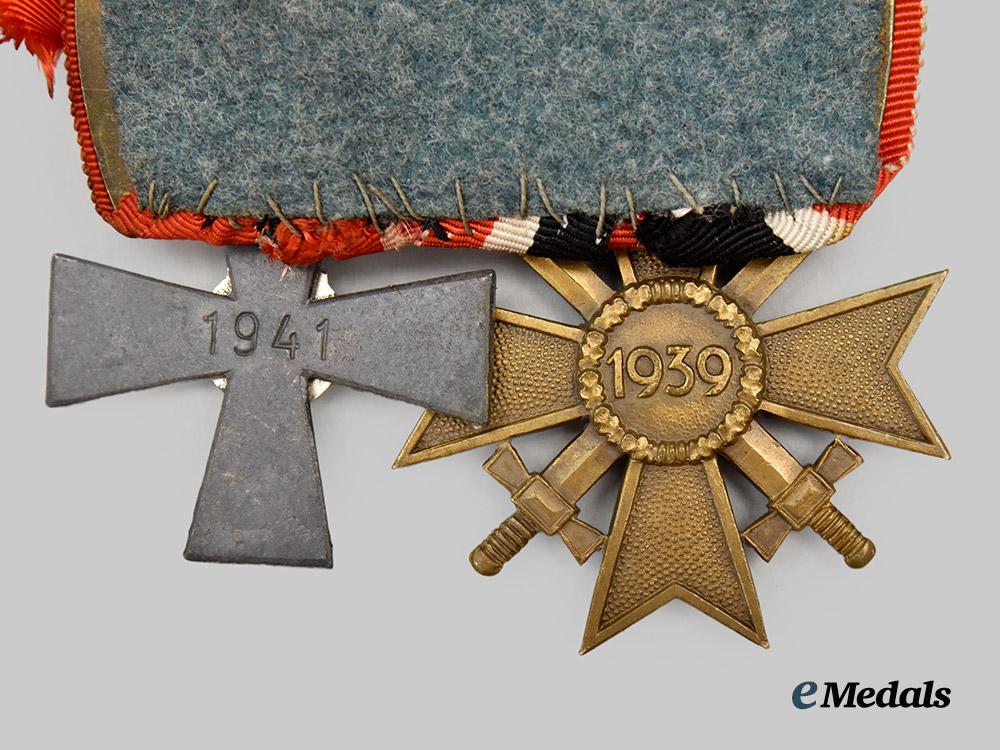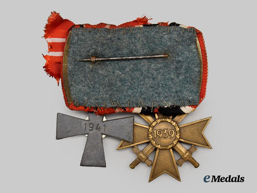 A medal bar featuring two decorations, including a War Merit Cross II Class with Swords, constructed of bronze, on loop for suspension with its period original ribbon, consisting of a Maltese Cross with pebbled arms and with crossed swords piercing the centrepiece, the obverse bearing a central wreathed mobile swastika, the reverse bearing a central wreathed date of “1939”, without visible marks, measuring 47.23 mm (w) x 49.37 mm (h), in extremely fine condition, and; a Finnish Order of the Cross of Liberty, IV Class, constructed of iron with silver and gilt, on loop for suspension with its period original ribbon pinned with combatant’s device, consisting of a Cross Pattée, the obverse overlaid by a narrow-armed gilded swastika, bearing a central silvered rose, the reverse bearing a central stamped date of “1941”, unmarked, measuring 38.61 mm (w) x 42.35 mm (h), demonstrating wear to the base metal resulting in some loss of gilt and silver finish, in very fine condition, both suspended from a 70 mm-long magnetic metal bar with a horizontal pinback and field-grey wool liner, unmarked, in near extremely fine condition, accompanied by a matching ribbon bar, with a magnetic metal core and horizontal pinback, measuring 30 mm in length, in extremely fine condition.