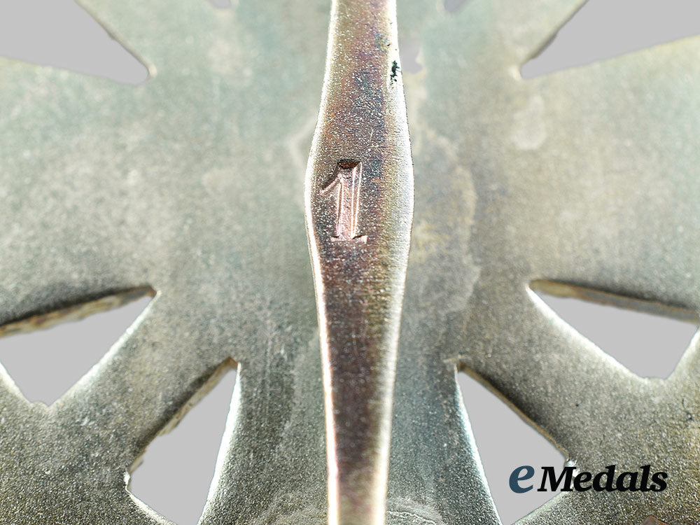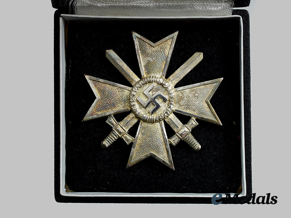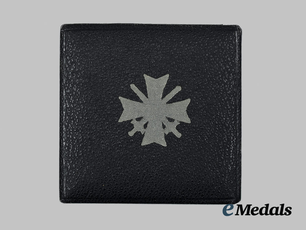 2. A I Class Cross with Swords, constructed of silvered tombak, consisting of a Maltese Cross with crossed swords piercing the centrepiece, the obverse with pebbled arms, bearing a central wreathed mobile swastika, the reverse with a raised barrel hinge and banjo-style pinback meeting a flat wire catch, the pinback maker marked with Präsidialkanzlei code “1” for Deschler & Sohn, Munich, measuring 48.46 mm (w) x 48.38 mm (h), weighing 23.3 grams, accompanied by its period original presentation case, constructed of a light wooden frame with a faux black leather exterior liner, the lid bearing a silvered depiction of the award, the interior with a white rayon lid liner and intact hinge cover, with a slotted black felt medal bed, unmarked, measuring 66 mm (w) x 66 mm (l) x 20 mm (h), the decoration demonstrating a patina consistent with storage conditions, an unissued example in near mint condition.