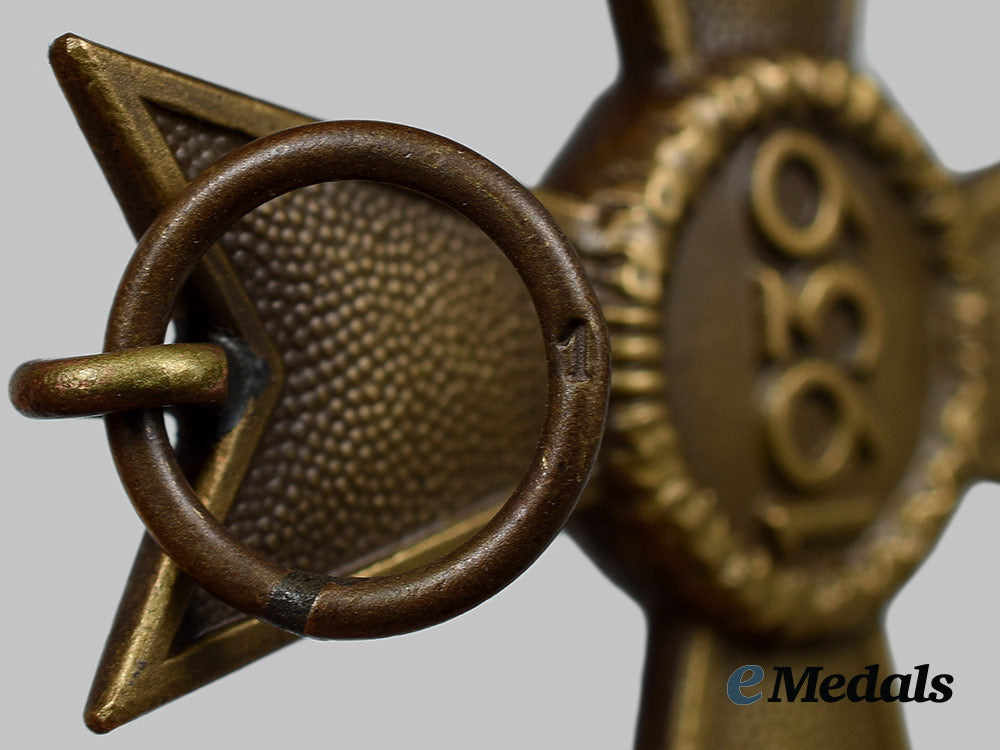 1. A II Class Cross, constructed of bronze, on loop for suspension from its period original ribbon, consisting of a Maltese Cross with pebbled arms, the obverse bearing a central wreathted mobile swastika, the reverse bearing a central wreathed date of “1939”, the suspension loop maker marked with Präsidialkanzlei code “1” for Deschler & Sohn, Munich, measuring 48.10 mm (w) x 49.15 mm (h), weighing 19.4 grams, accompanied by its original package of issue, constructed of light brown paper stock, the exterior bearing an inscription of “KRIEGSVERDIENSTKREUZ 2. KLASSE OHNE SCHWERTER” and a maker’s mark of “DESCHLER & SOHN, MÜNCHEN”, 6 cm (w) x 10.5 cm (h), in near mint condition.