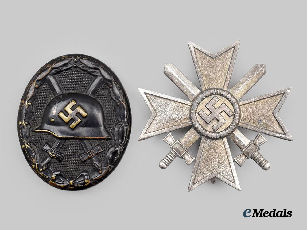 2. A Black Grade Wound Badge, constructed of blackened bronze, the obverse consisting of an oval laurel leaf wreath, joined together at the bottom by ribbon, with a central raised Stahlhelm overlaid by a mobile swastika, on top of crossed swords on a pebbled field, the reverse a raised barrel hinge and vertical pinback meeting a round wire catch, unmarked, measuring 36.42 mm (w) x 43.80 mm (h), weighing 12.8 grams, demonstrating minor loss of finish to high-contact points, in better than very fine condition.