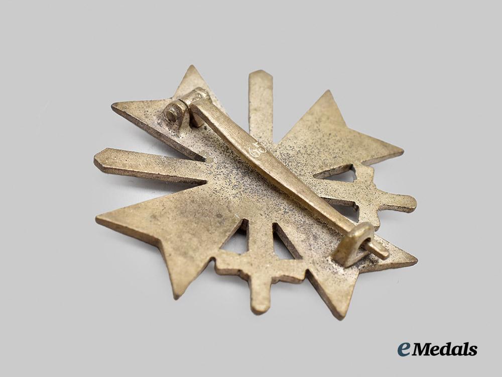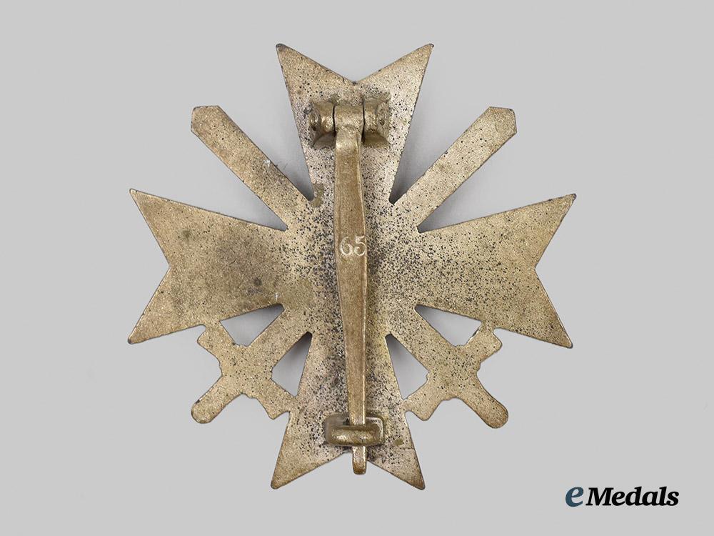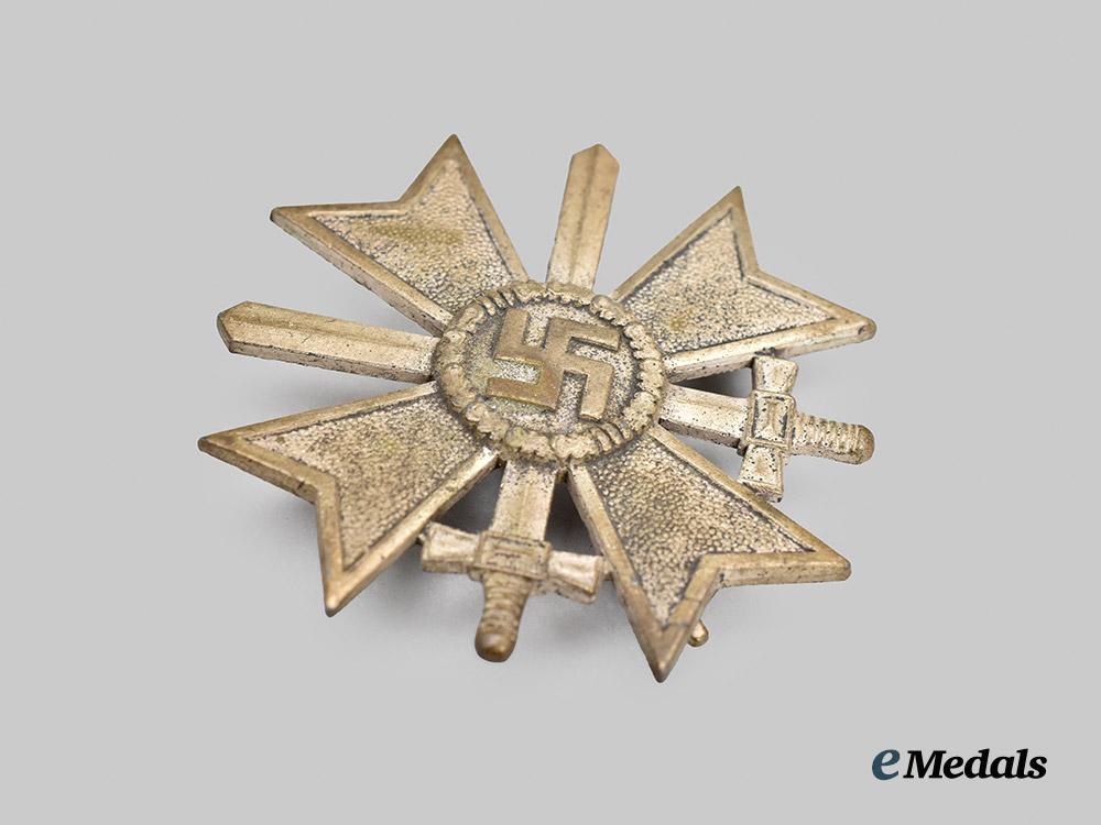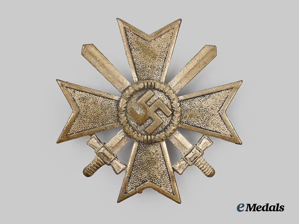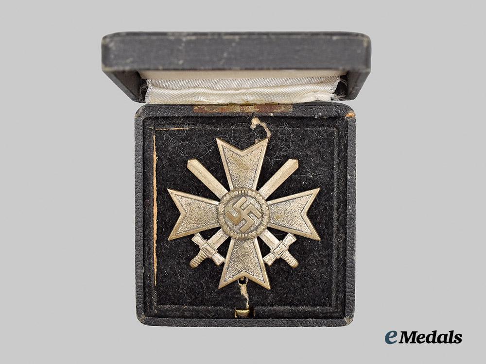 (Kriegsverdienstkreuz I. Klasse mit Schwertern und Etui). Constructed of silvered zink, consisting of a Maltese Cross with pebbled arms and with crossed swords piercing the centrepiece, the obverse bearing a central wreathed mobile swastika, the reverse with an integral hinge and tapering vertical pinback meeting a rounded catch, the pinback maker marked with Präsidialkanzlei code “65” for Klein & Quenzer, Idar-Oberstein, measuring 47.48 mm (w) x 47.48 mm (h), weighing 17.2 grams, accompanied by its original presentation case, constructed of a pressed card stock frame with a faux black leather exterior liner, the lid bearing a silvered depiction of the award, the interior with a white rayon lid liner and slotted black felt medal bed, unmarked, measuring 70 mm (w) x 70 mm (l) x 20 mm (h), demonstrating moderate loss of finish through the base metal of the award and material fatigue to the case, the latter resulting in the loss of functionality to its spring catch, in overall very fine condition.