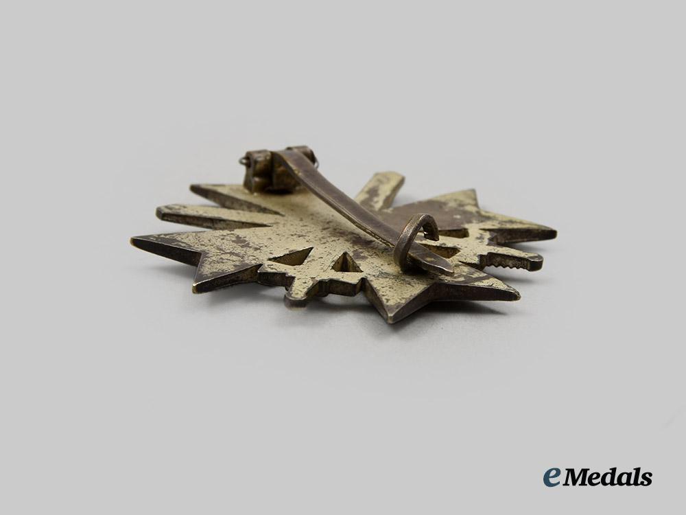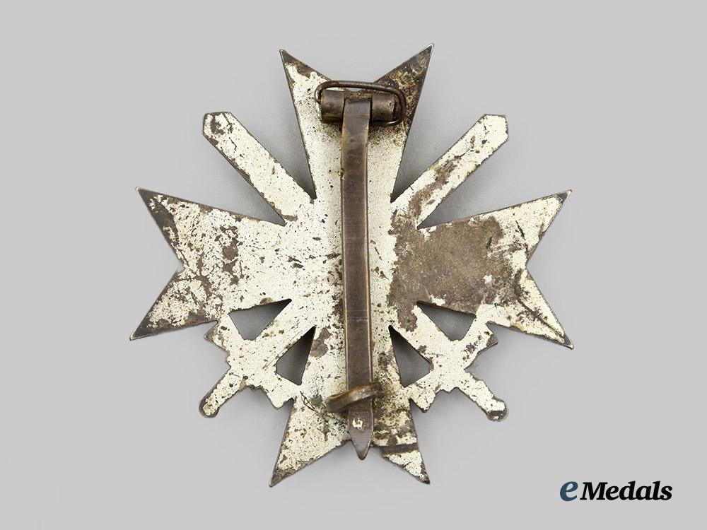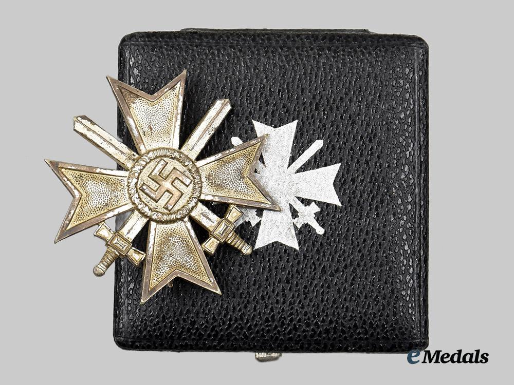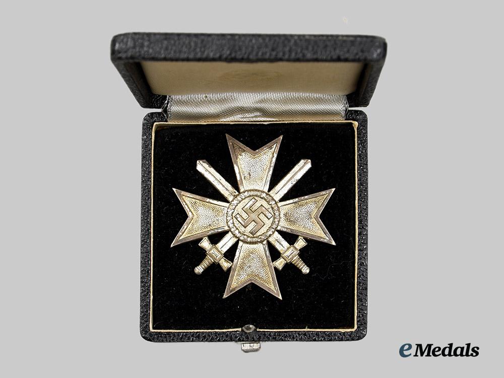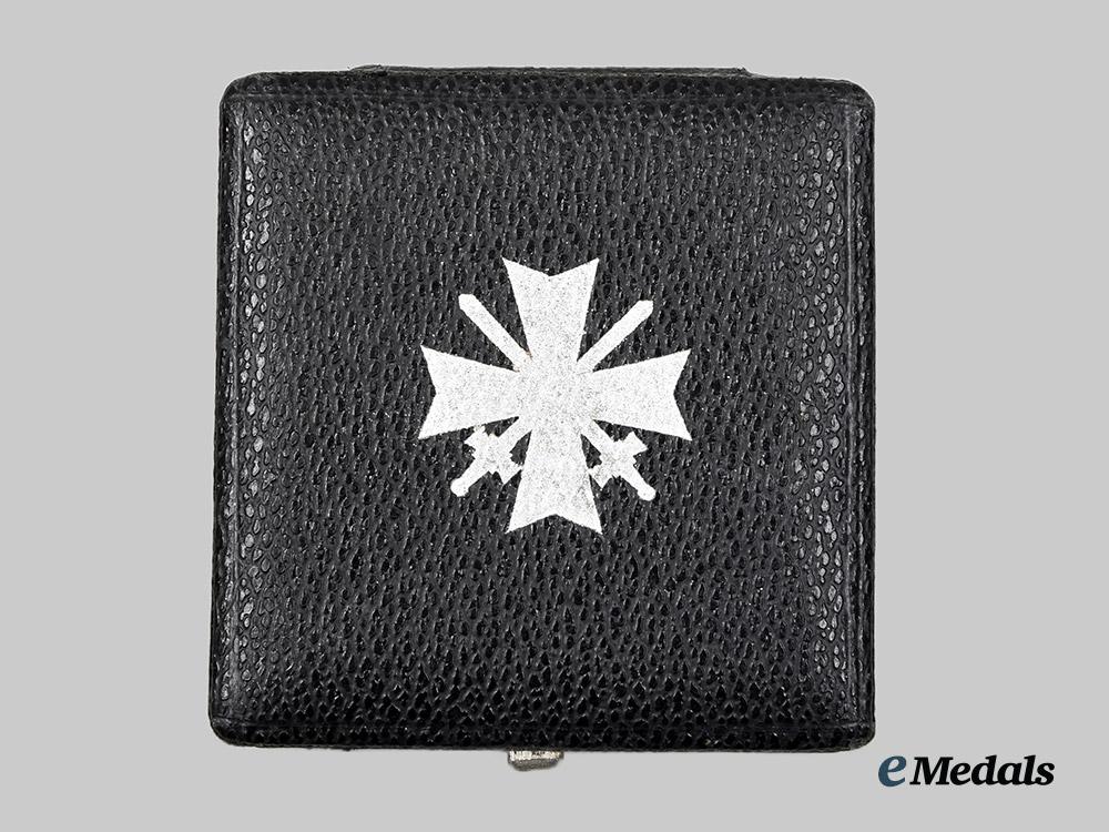 (Kriegsverdienstkreuz I. Klasse mit Schwertern und Etui). Constructed of silvered tombak, consisting of a Maltese Cross with crossed swords piercing the centrepiece, the obverse with pebbled arms, bearing a central wreathed mobile swastika, the reverse with a raised barrel hinge and flattened vertical pinback meeting a flat wire catch, unmarked, measuring 47.94 mm (w) x 47.65 mm (h), weighing 22.9 grams, accompanied by its original presentation case, constructed of a pressed card stock frame with a faux black leather exterior liner, the lid bearing a silvered depiction of the award, the interior with a white rayon lid liner and intact hinge cover, with a slotted black felt medal bed, closing with a functional metal spring catch with exterior stud release, unmarked, measuring 65 mm (w) x 65 mm (l) x 20 mm (h), the hinge pin has been crudely replaced with wire and moderate loss of silver finish is evident throughout the base metal, in overall very fine condition.