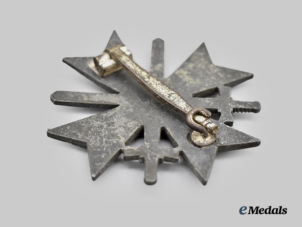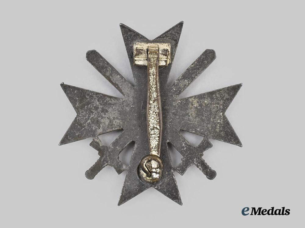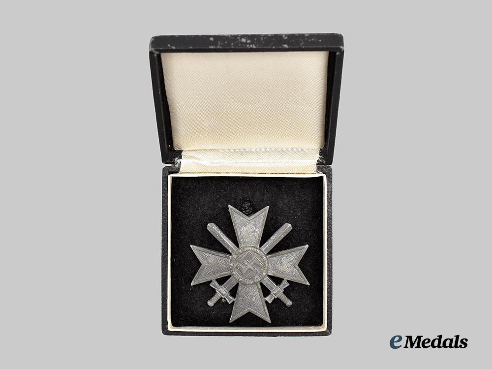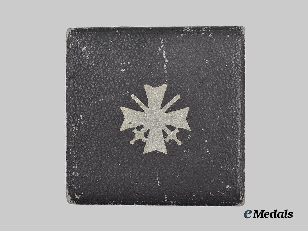 (Kriegsverdienstkreuz I. Klasse mit Schwertern und Etui). Constructed of silvered zink, consisting of a Maltese Cross with crossed swords piercing the centrepiece, the obverse with pebbled arms and a central wreathed mobile swastika, the reverse with a block hinge and tapering vertical pinback meeting a round wire catch emanating from a circular plate, maker marked with Präsidialkanzlei code “3” for Wilhelm Deumer, Lüdenscheid, measuring 47.33 mm (w) x 47.32 mm (h), weighing 17.6 grams, accompanied by its original presentation case, constructed of a pressed card stock frame with a faux black leather exterior liner, the lid bearing a silvered depiction of the award, the interior with a white rayon lid liner and intact hinge cover, with a slotted black felt medal bed, unmarked, measuring 70 mm (w) x 70 mm (l) x 15 mm (h), demonstrating near-total loss of silver finish to the base metal and an unusual transitional round wire catch on a plate which demonstrates poor application or a period repair, a late-war example in overall very fine condition.