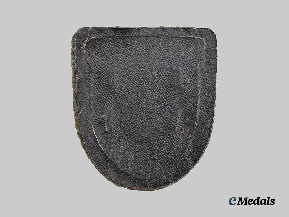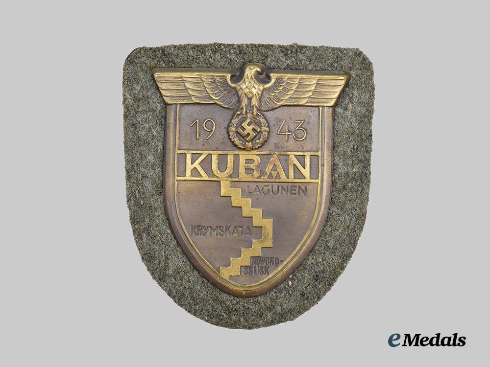 (Heer Kubanschild). Constructed of bronzed magnetic metal, the obverse consisting of a shield bearing a stylized map of the Kuban region, topped by a raised inscription of “KUBA” and a Wehrmacht eagle clutching a wreathed mobile swastika, in turn flanked by a date of “1943”, affixed with all four reverse attachment prongs to a magnetic metal backplate with a field-grey wool liner and intact faux black leather backer, unmarked, the shield measuring 52.40 (w) x 61.64 mm (h), in extremely fine condition.