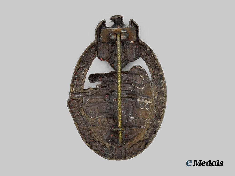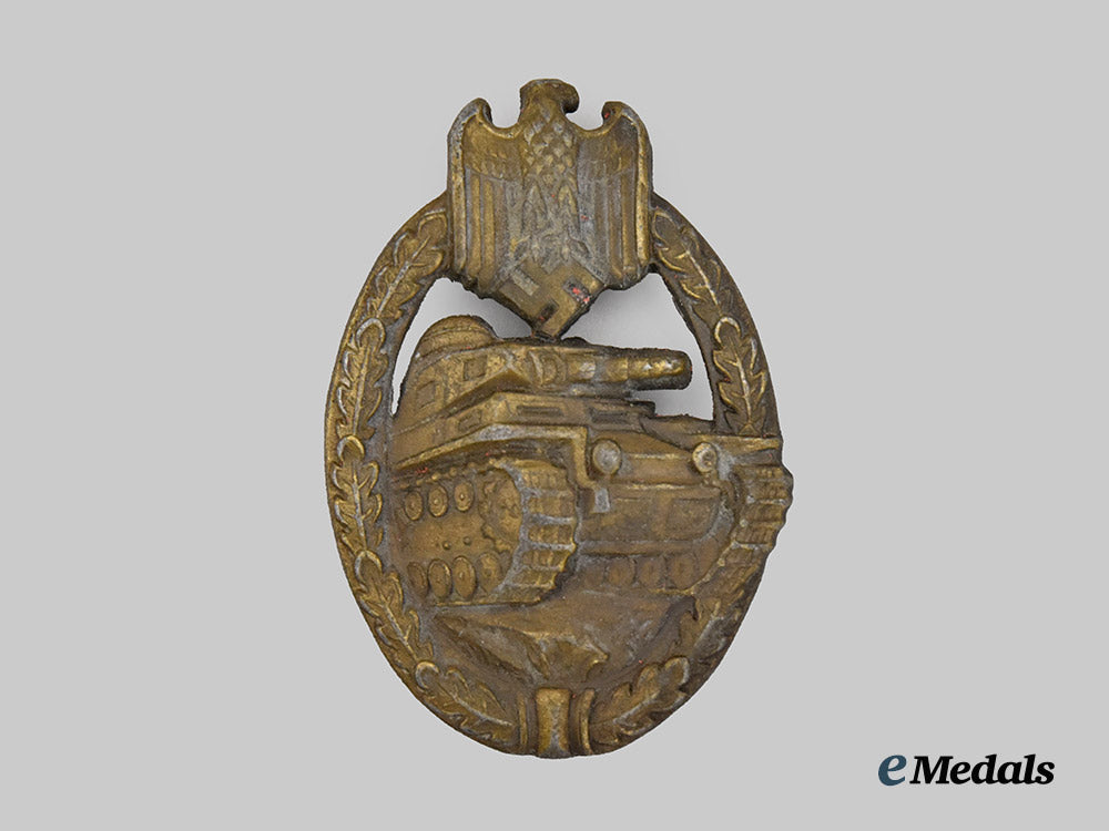 (Panzerkampfabzeichen in Bronze). Instituted December 20th, 1939. (Mid to Late War Issue). A textbook example by this maker. Constructed of bronzed zinc, the obverse consisting of an oval oak leaf wreath, joined together at the bottom by ribbon, topped by a Heer-style German national eagle clutching a mobile swastika, around a central Panzer IV rolling over grassy terrain, with its left tread extending beyond the edge of the wreath, the reverse with a large rectangular shaped base plate signature of production by Wilhelm Deumer, with a small barrel hinge, straight vertical pinback, and catch soldered onto a round baseplate, unmarked but displaying all typical manufacturing characteristics of Wilhelm Deumer, measuring 41.2 mm (w) x 60.0 mm (l), weighing 19.59 grams, with nearly all of its original finish remaining, in extremely fine condition.