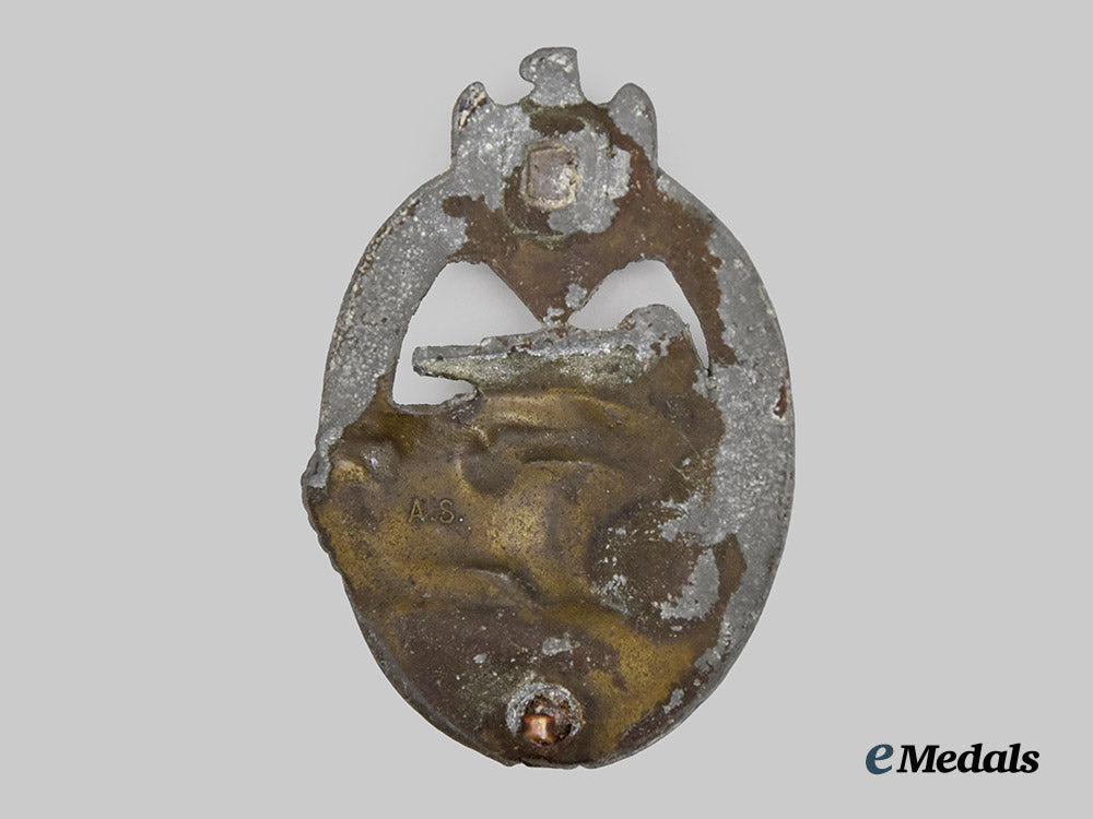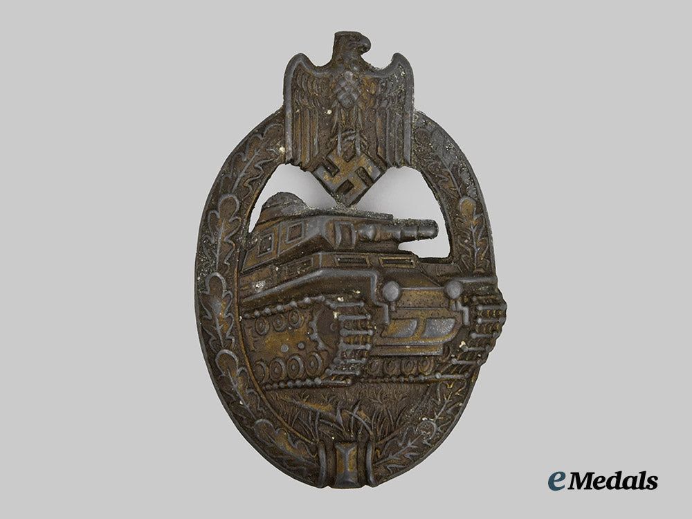 (Panzerkampfabzeichen in Bronze). Constructed of bronzed zink, the obverse consisting of an oval oak leaf wreath, joined together at the bottom by ribbon, topped by a Heer-style German national eagle clutching a mobile swastika, surrounding a central Panzer IV rolling over grassy terrain, with its left tread extending beyond the edge of the wreath, the reverse with a flat wire catch emanating from a crimped base, maker marked with the logo of Adolf Scholze, Gablonz, measuring 42.92 mm (w) x 62.90 mm (h), weighing 23.2 grams, the base metal demonstrates the loss of most of its bronze finish with consequent surface oxidation, while the reverse is missing both the hinge and pinback, in fair condition.