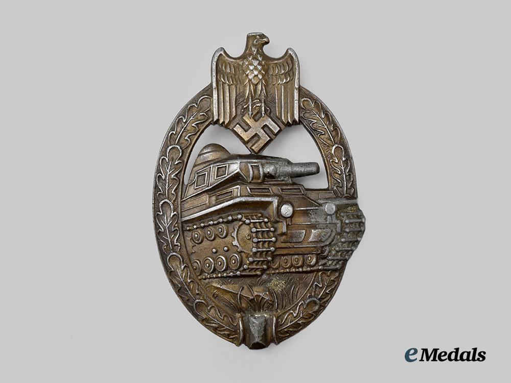 (Panzerkampfabzeichen in Bronze). Constructed of bronzed zink, the obverse consisting of an oval oak leaf wreath, joined together at the bottom by ribbon, topped by a Heer-style German national eagle clutching a mobile swastika, surrounding a central Panzer IV rolling over grassy terrain, with its left tread extending beyond the edge of the wreath, the reverse with a ball hinge emanating from a crimped base and vertical pinback meeting a flat wire catch, maker marked with the “AS in Triangle” logo for an unidentified manufacturer (which circumstantial evidence suggests is Adolf Scholze, Grünwald), measuring 42.43 mm (w) x 63.58 mm (h), weighing 24.6 grams, demonstrating moderate loss of bronze finish, a demonstrating characteristics of this manufacturer’s second die, in extremely fine condition.