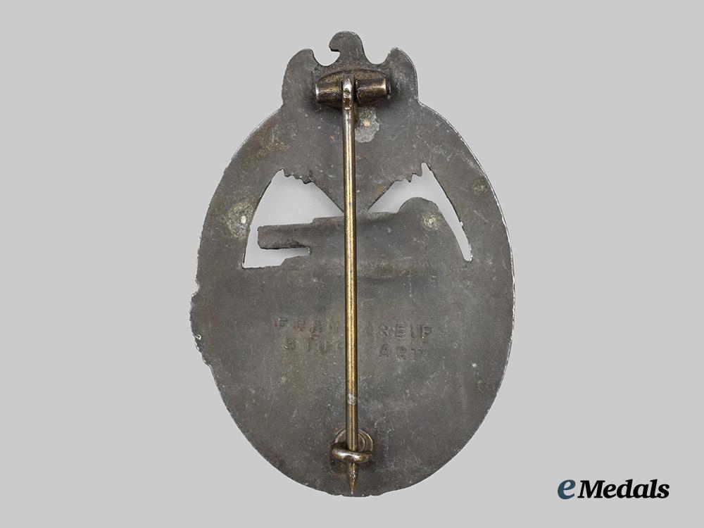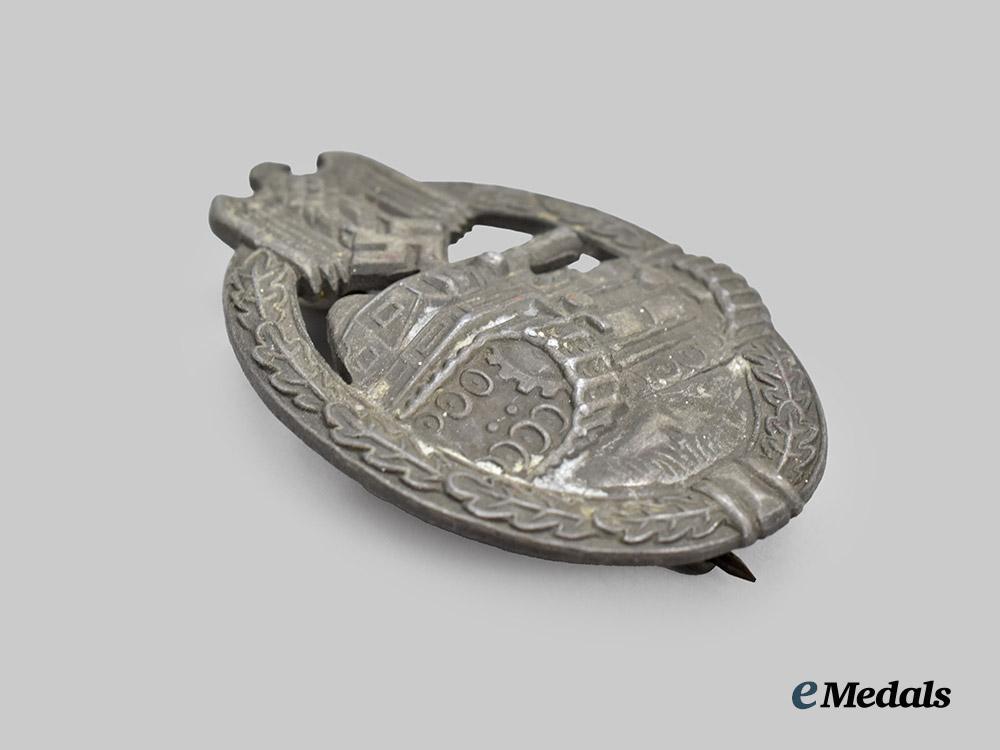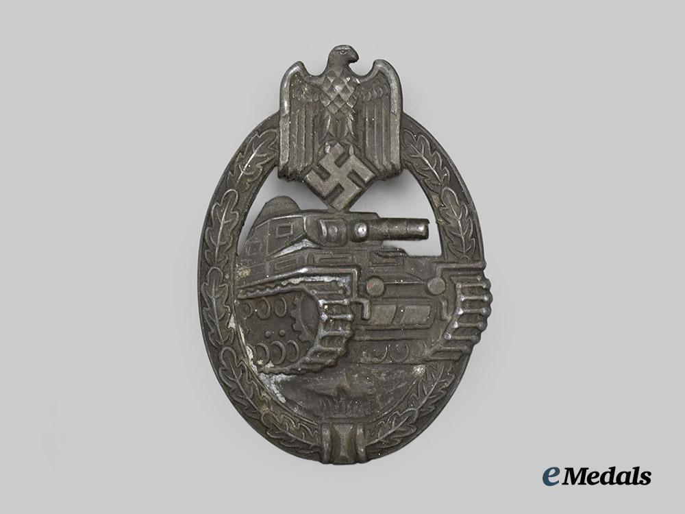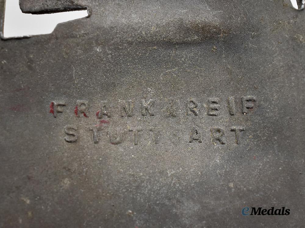 (Panzerkampfabzeichen in Bronze). Constructed of bronzed zink, the obverse consisting of an oval oak leaf wreath, joined together at the bottom by ribbon, topped by a Heer-style German national eagle clutching a mobile swastika, surrounding a central Panzer IV rolling over grassy terrain, with its left tread extending beyond the edge of the wreath, the reverse with a crimped hinge and vertical pinback meeting a round wire catch emanating from a circular base, maker marked “FRANK & REIF, STUTTGART”, measuring 42.22 mm (w) x 60.27 mm (h), weighing 25.3 grams, demonstrating near-total loss of bronze finish to the base metal with minor and sporadic oxidation, a “central maker mark” variant in better than very fine condition.