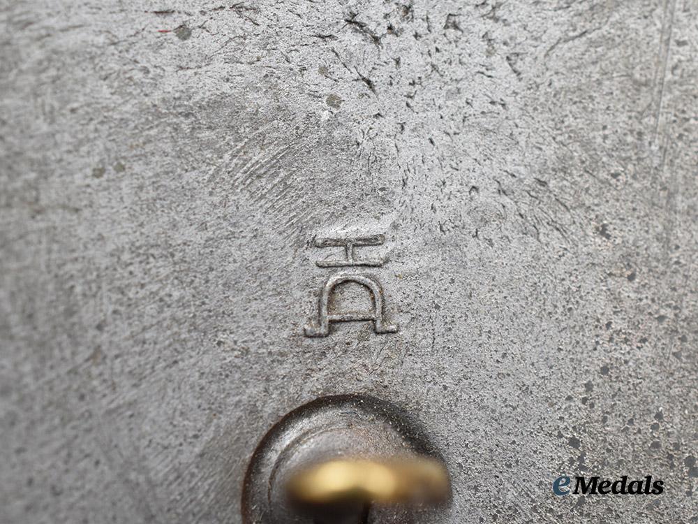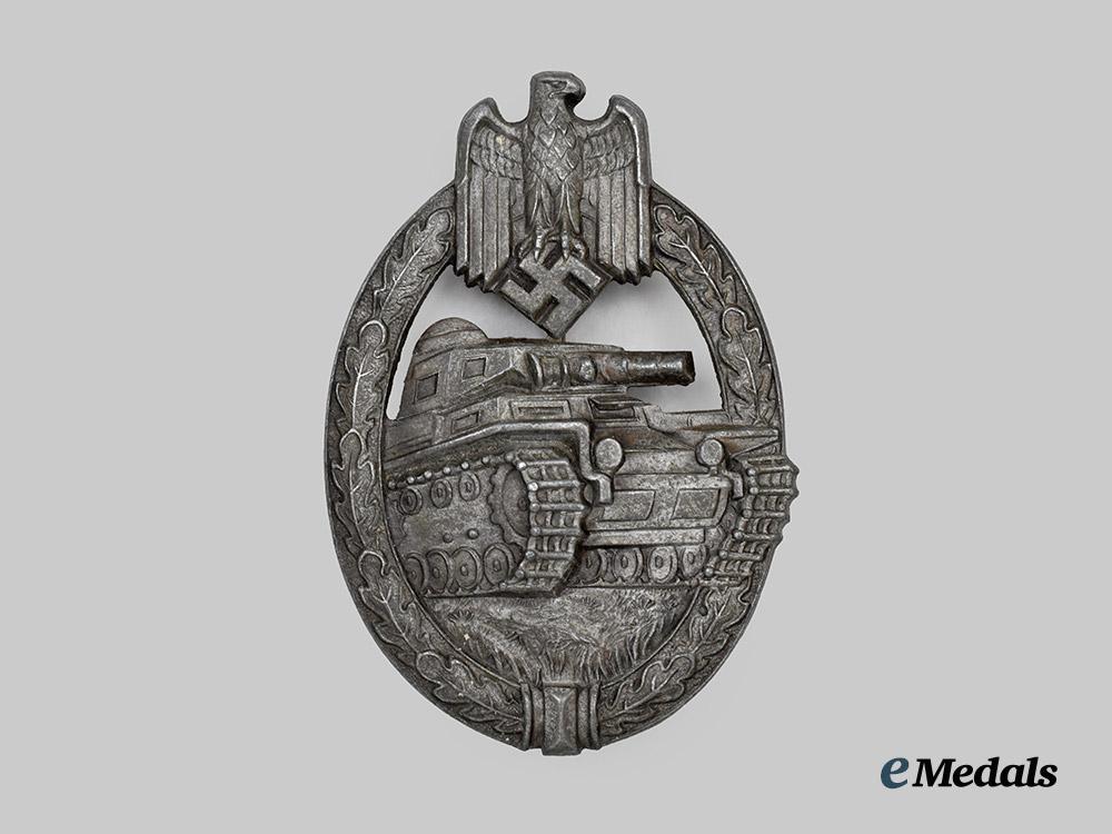 (Panzerkampfabzeichen in Bronze). Constructed of bronzed zink, the obverse consisting of an oval oak leaf wreath, joined together at the bottom by ribbon, topped by a Heer-style German national eagle clutching a mobile swastika, surrounding a central Panzer IV rolling over grassy terrain, with its left tread extending beyond the edge of the wreath, the reverse with a barrel hinge situated within a circular crimped base and vertical pinback meeting a round wire catch emanating from a crimped base, maker marked with the logo of Hermann Aurich, Dresden, measuring 41.71 mm (w) x 60.09 mm (h), weighing 32.5 grams, demonstrating near-total loss of bronze finish to the base metal, an uncommon solid zink Aurich variant in near extremely fine condition.
