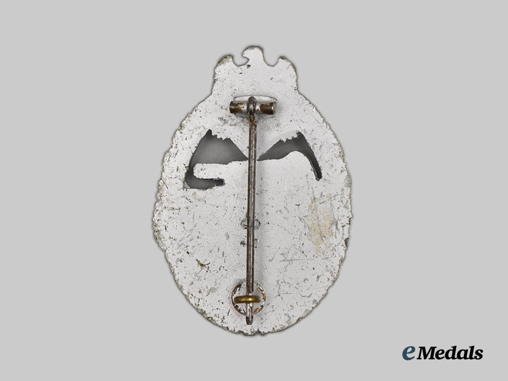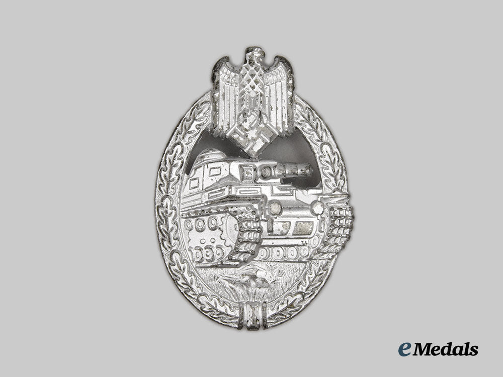(Panzerkampfabzeichen in Silber). Constructed of silvered zink, the obverse consisting of an oval oak leaf wreath, joined together at the bottom by ribbon, topped by a Heer-style German national eagle clutching a mobile swastika, around a central Panzer IV rolling over grassy terrain, with its left tread extending beyond the edge of the wreath, the reverse with a crimped hinge and vertical pinback meeting a round wire catch, maker marked with the logo of Friedrich Linden, Lüdenscheid, measuring 42.33 mm (w) x 60.15 mm (h), weighing 38.2 grams, a scarce zink example retaining virtually all of its original finish, in extremely fine condition.