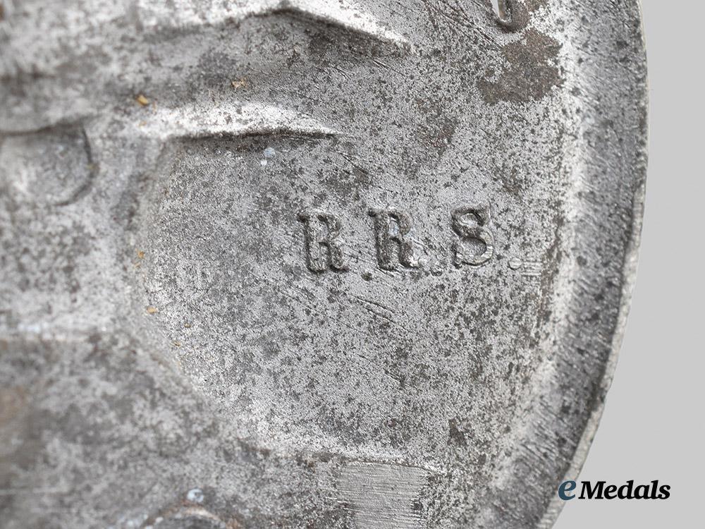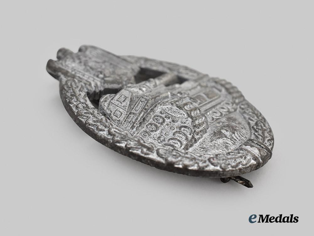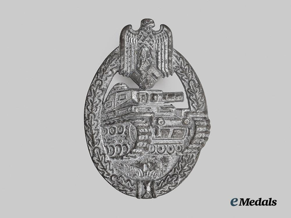 (Panzerkampfabzeichen in Silber). Constructed of silvered zink, the obverse consisting of an oval oak leaf wreath, joined together at the bottom by ribbon, topped by a Heer-style German national eagle clutching a mobile swastika, surrounding a central Panzer IV rolling over grassy terrain, with its left tread extending beyond the edge of the wreath, the reverse with a crimped hinge and vertical pinback meeting a round wire catch, maker marked with the logo of Rudolf Richter, Schlag bei Gablonz, measuring 41.82 mm (w) x 59.86 mm (h), weighing 35.1 grams, demonstrating moderate loss of silver finish throughout, in better than very fine condition.