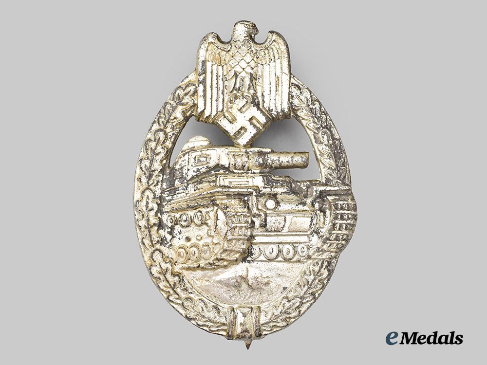 (Panzerkampfabzeichen in Silber). Constructed of silvered zink, the obverse consisting of an oval oak leaf wreath, joined together at the bottom by ribbon, topped by a Heer-style German national eagle clutching a mobile swastika, surrounding a central Panzer IV rolling over grassy terrain, with its left tread extending beyond the edge of the wreath, the reverse with a crimped hinge and vertical pinback meeting a flat wire catch, maker marked with the wide-version logo of Rudolf Souval, Vienna, measuring 41.96 mm (w) x 60.13 mm (h), weighing 29.2 grams, demonstrating period replacement of the catch, in near extremely fine condition.