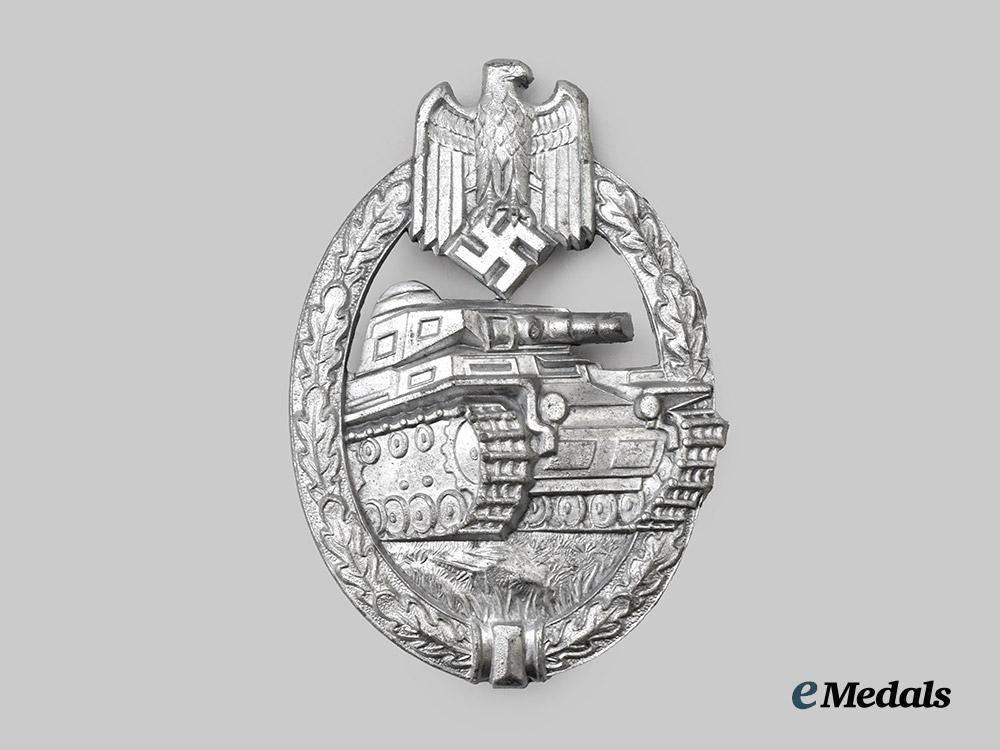 (Panzerkampfabzeichen in Silber). Constructed of silvered zink, the obverse consisting of an oval oak leaf wreath, joined together at the bottom by ribbon, topped by a Heer-style German national eagle clutching a mobile swastika, surrounding a central Panzer IV rolling over grassy terrain, with its left tread extending beyond the edge of the wreath, the reverse with a crimped barrel hinge and vertical pinback meeting a round wire catch emanating from a crimped base, maker marked with the logo of Hermann Aurich, Dresden, measuring 41.36 mm (w) x 59.98 mm (h), weighing 32.4 grams, the obverse retains all of its original silver finish while the reverse demonstrates loss of finish consistent with recipient wear, a striking example in extremely fine condition.