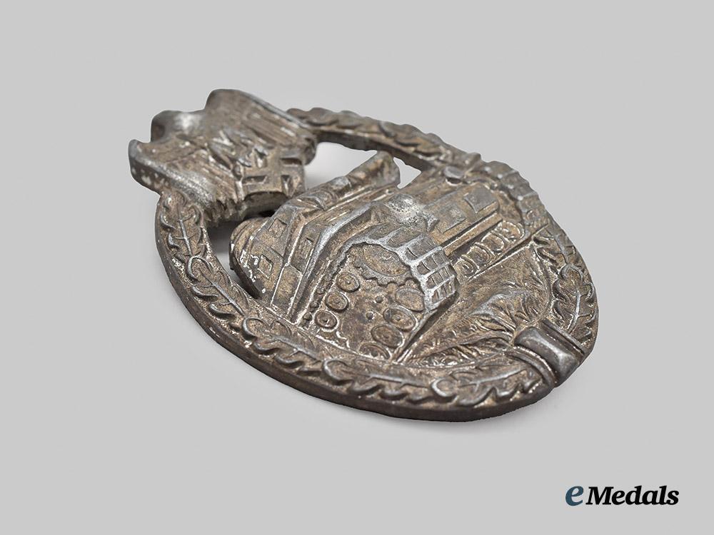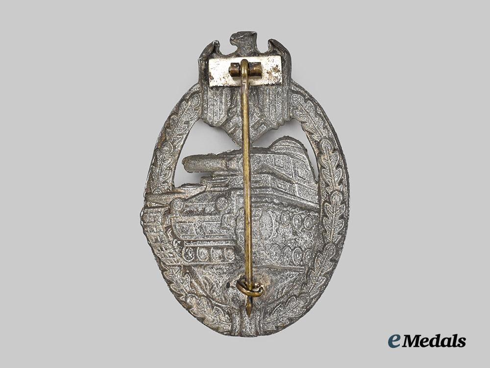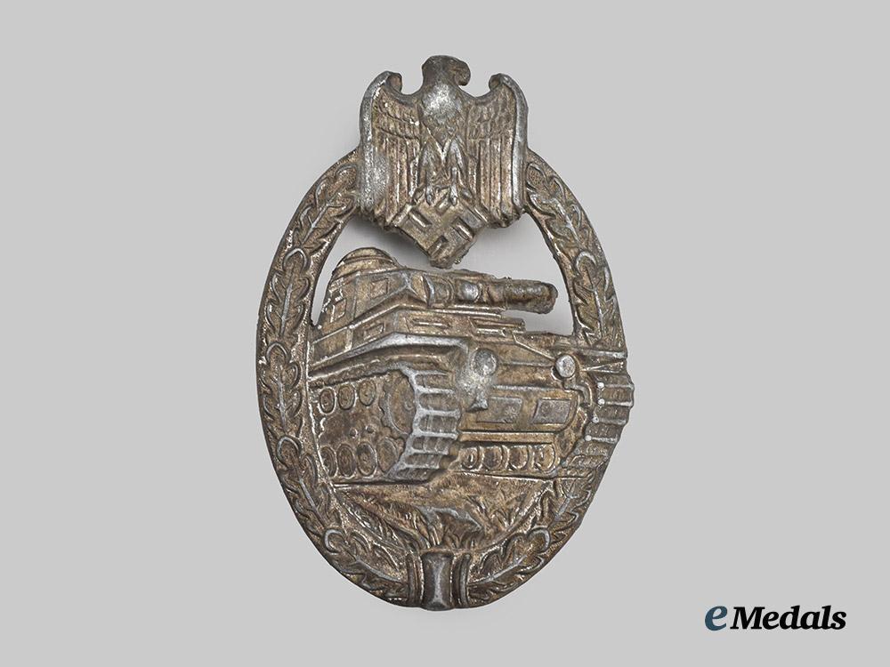 (Panzerkampfabzeichen in Silber). Constructed of silvered zink, the obverse consisting of an oval oak leaf wreath, joined together at the bottom by ribbon, topped by a Heer-style German national eagle clutching a mobile swastika, surrounding a central Panzer IV rolling over grassy terrain, with its left tread extending beyond the edge of the wreath, the reverse with a raised barrel hinge emanating from a rectangular plate and vertical pinback meeting a flat wire catch, unmarked but demonstrating the characteristics of an early zink variant produced by Wilhelm Deumer, Lüdenscheid, measuring 40.70 mm (w) x 59.89 mm (h), weighing 19.5 grams, demonstrating loss of silver finish throughout the base metal and some denting and bending to the eagle commonly encountered on this model, a scarce version in better than very fine condition.