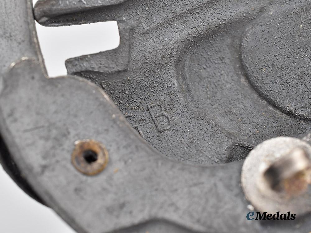 (Panzerkampfabzeichen in Silber mit Einsatzzahl "50"). Constructed of silvered zink, the obverse consisting of an oval oak leaf wreath, joined together at the bottom by a raised plaque bearing a raised and gilded number “50”, topped by a Heer-style German national eagle clutching a mobile swastika, surrounding a central Panzer IV rolling over logs and with its left tread extending beyond the edge of the wreath, the reverse with three visible hollow rivets utilizing hollow examples produced by Stocko, Wuppertal, as commonly used by this manufacturer, with a crimped hinge and vertical pinback meeting a flat wire catch emanating from a circular plate (an unusual but wartime-documented variant as examined in “The German Panzer Assault Badge of World War II: Volume II”, Philippe de Bock, 2021, page 927), maker marked with the logo of Gustav Brehmer, Markneukirchen, measuring 47.58 mm 9w) x 62.33 mm (h), weighing 26.0 grams, demonstrating near-total loss of silver finish throughout with additional bending of the catch, a rare example featuring Brehmer’s uncommon hardware in better than very fine condition.