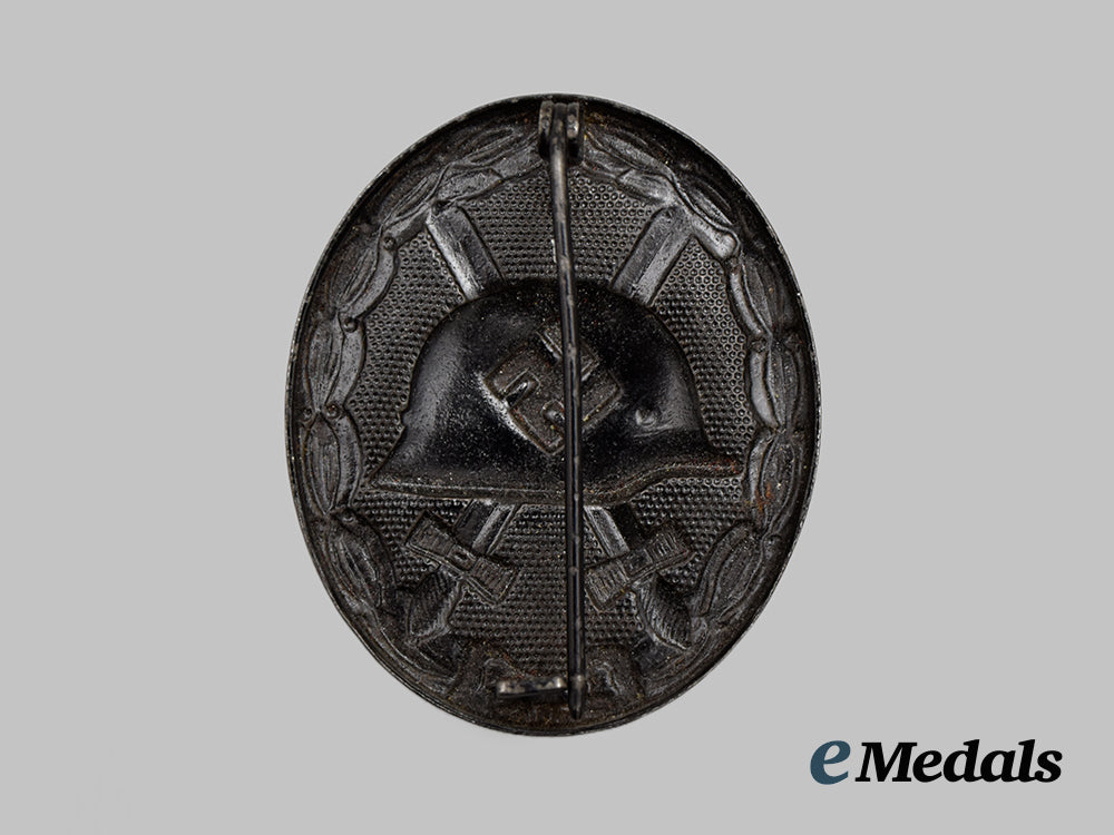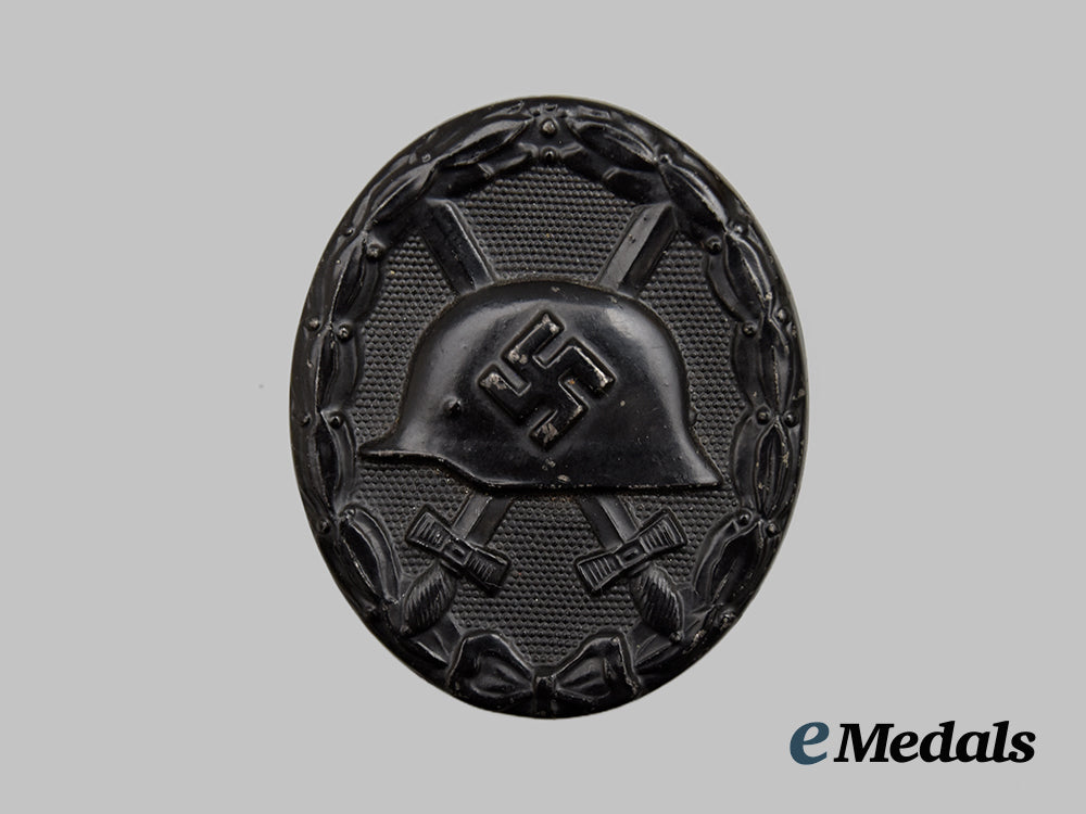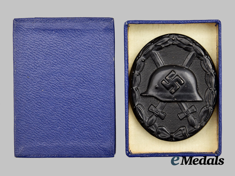 (Verwundetenabzeichen in Schwarz). Constructed of black painted magnetic metal, the obverse consisting of an oval laurel leaf wreath, joined together at the bottom by a ribbon, the obverse with a central raised Stahlhelm overlaid by a mobile swastika on-top of crossed swords on a pebbled field, the reverse with a broad hinge, vertical pin back, and stamped catch, unmarked, measuring 36.7 mm (w) x 44.1 mm (l), weighing 11.1 grams. Accompanied by its carton of issue, constructed of cardstock with a blue leatherette exterior, with a removable lid, measuring 55 mm (w) x 41 mm (l), with some of the black paint having come off the badge, but in overall better than extremely fine condition.
