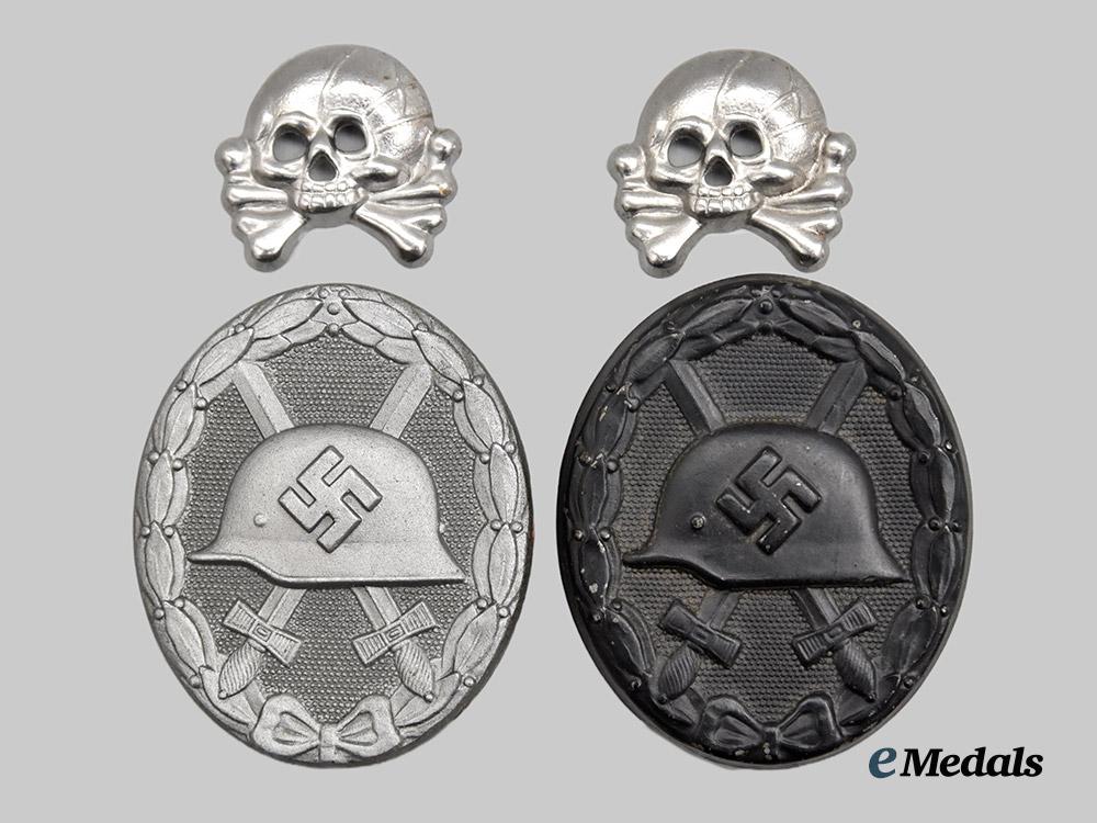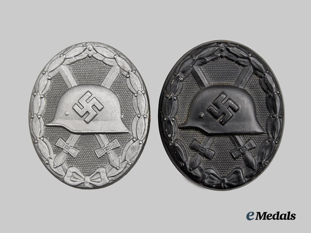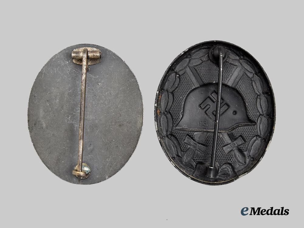 1. A Black Grade Wound Badge, constructed of blackened magnetic metal, the obverse consisting of an oval laurel leaf wreath, joined together at the bottom by ribbon, with a central raised Stahlhelm overlaid by a mobile swastika, on top of crossed swords on a pebbled field, the reverse with a ball hinge and vertical pinback meeting a flattened catch, maker marked with Präsidialkanzlei code “93” for Richard Simm & Söhne, Gablonz, measuring 37.98 mm (w) x 45.27 mm (h), weighing 12.2 grams, in extremely fine condition.