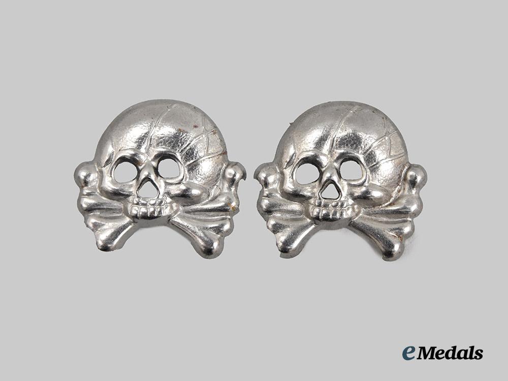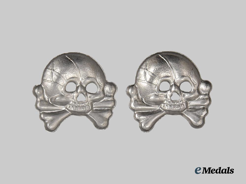 3. A matching set of Wehrmacht Panzer personnel collar devices, each constructed of magnetic metal, both absent reverse attachment prongs for sew-on application, both unmarked and measuring 24 mm (w) x 23 mm (h), in unissued and near mint condition.