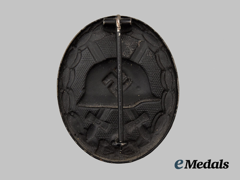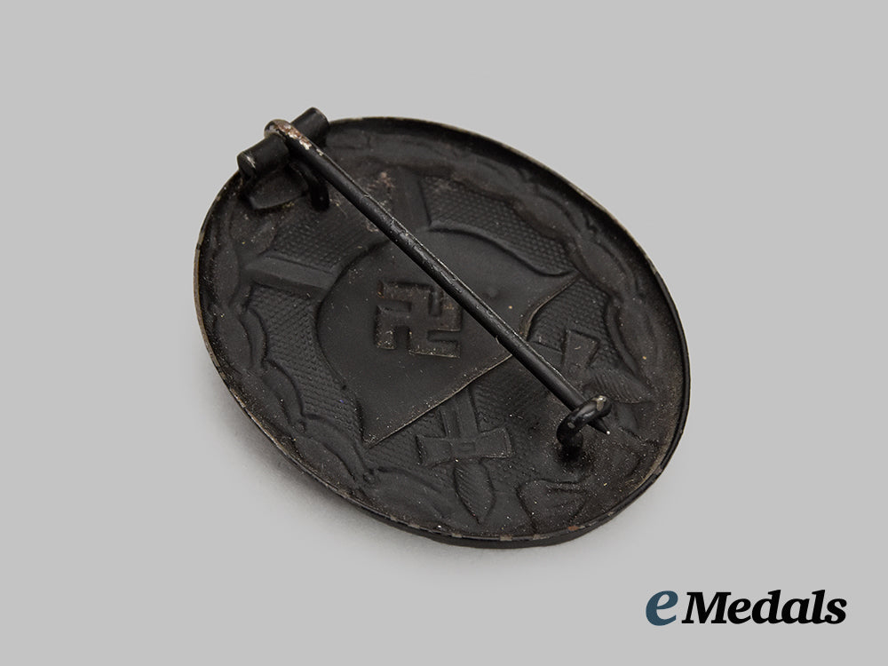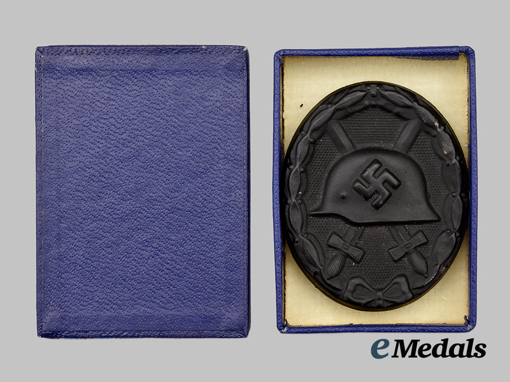 (Verwundetenabzeichen in Schwarz mit Etui). Constructed of blackened magnetic metal, the obverse consisting of an oval laurel leaf wreath, joined together at the bottom by ribbon, with a central raised Stahlhelm overlaid by a mobile swastika, on top of crossed swords on a pebbled field, the reverse with a crimped hinge and vertical pinback meeting a round wire catch, unmarked, measuring 37.11 mm (w) x 44.93 mm (h), weighing 11.7 grams, accompanied by a period case, of two-piece card stock construction, the exterior with a faux dark blue leather liner, the interior lid stamped with an LDO insignia, with a beige felt medal bed, measuring 40 mm (w) x 58 mm (l) x 15 mm (h), demonstrating minor loss of finish to the base, in overall near extremely fine condition.