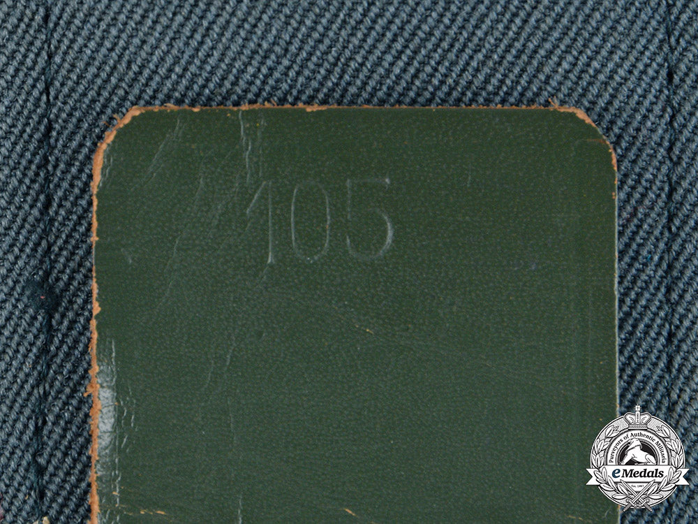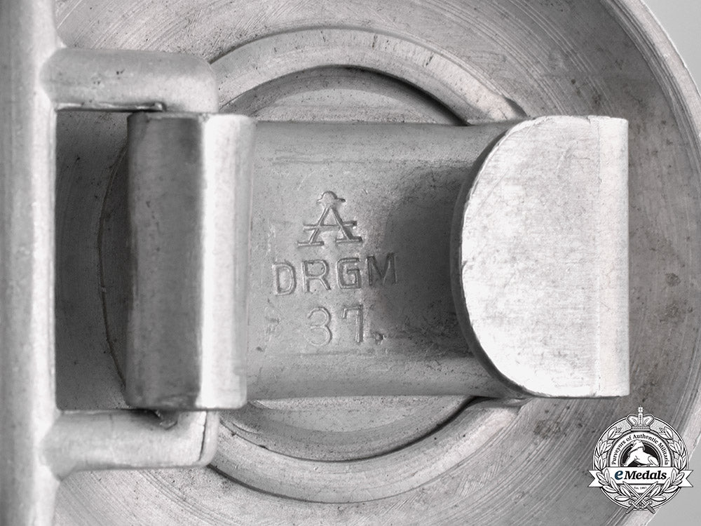 (Feldbindenschloss). A silvered die-stamped aluminum belt buckle, on the right end of the belt, illustrating a mobile swastika with a half-wreath of oak leaves and acorns tied with a ribbon at the base below, inscribed “Gott mit uns” above, on a fine pebbled background, the reverse presents the maker mark for Assmann with the letters DRGM (Deutsches Reich Gebrauchsmuster / German Reich Registered Design) and the number 37, measures 49.19 mm in diameter, attached to a 45 mm wide aluminium brocade with woven alternate oak leaves and SS runes, with alternate black and aluminum stripes top and bottom, the slides were of the same pattern but without the oak leaves and SS runes, with a field-grey underside, a thick, green leather tab stitched in place on the underside of the left side, with nine rows of two holes each for length adjustment, stamped with “105” at the end, matching a silvered aluminum receiving clip, measures 111 cm in length, and in near mint condition.