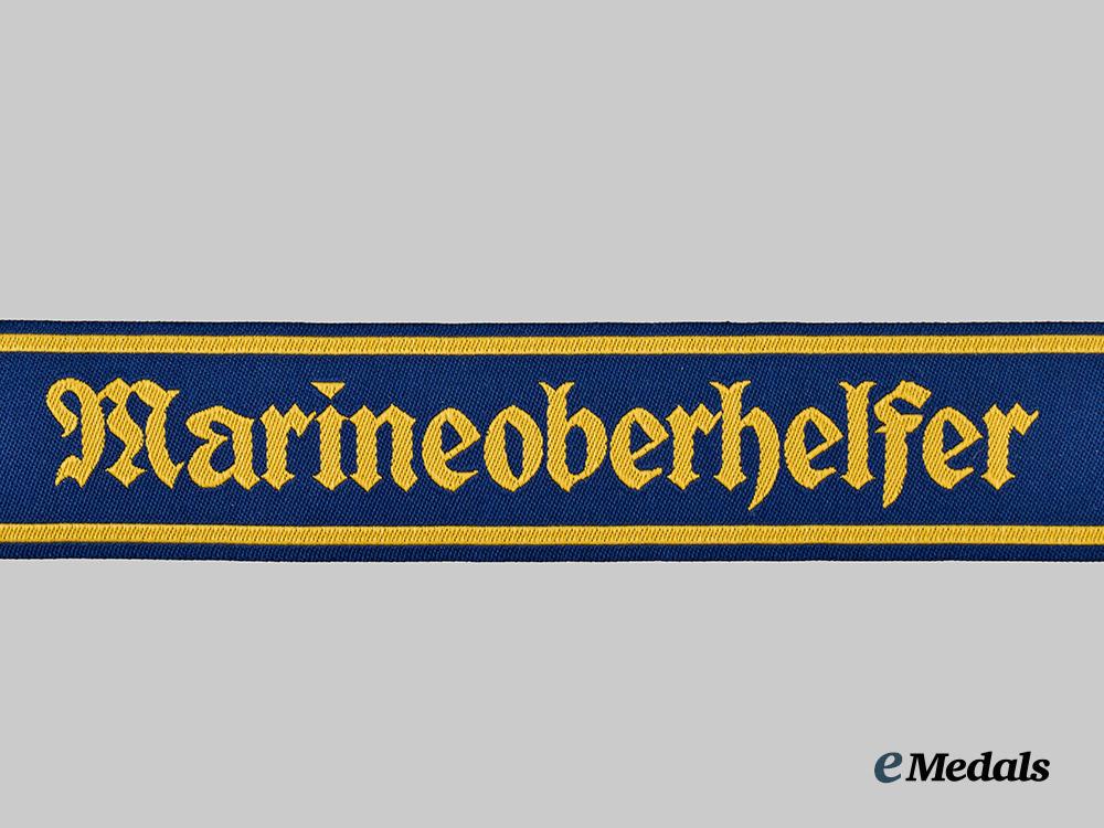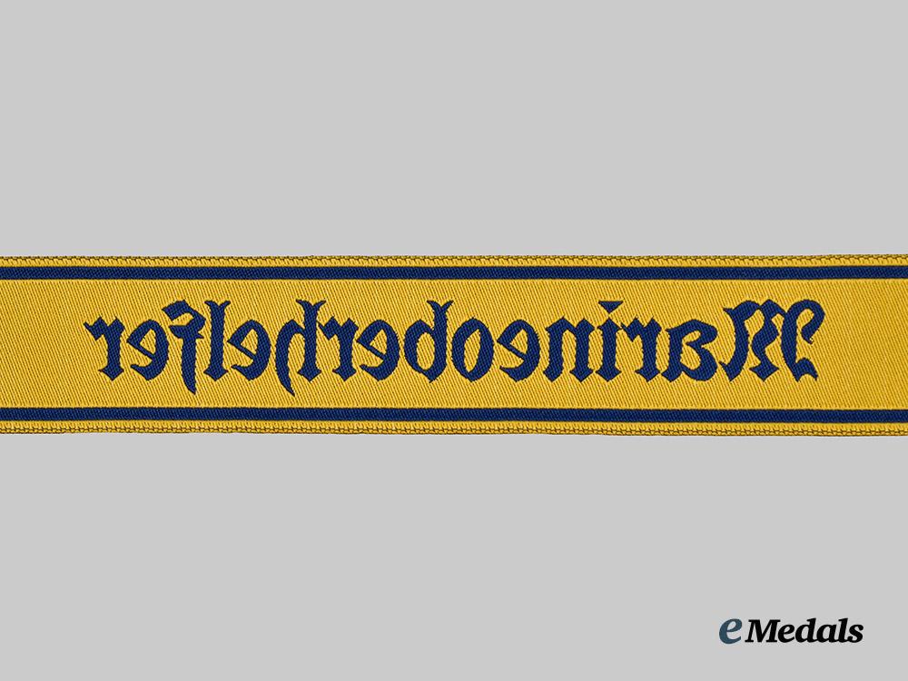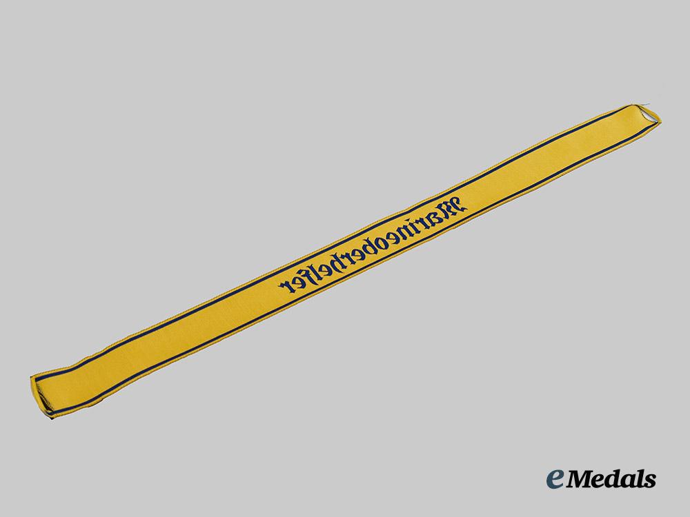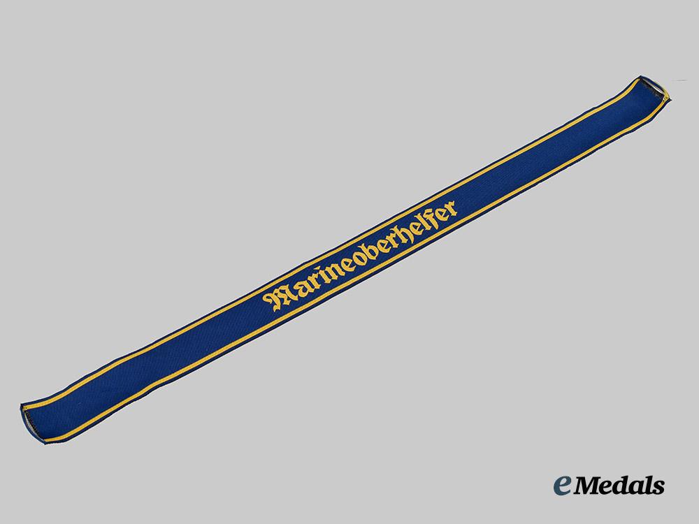(Kriegsmarine Ärmelband für Marineoberhelfer). Constructed of dark navy blue rayon, the exterior trimmed along both the top and bottom edges with machine-embroidered golden-yellow tresses, with a central inscription of “MARINEOBERHELFER” in Fraktur script of identical construction, unmarked, measuring 33 mm (w) x 455 mm (l), in extremely fine condition.