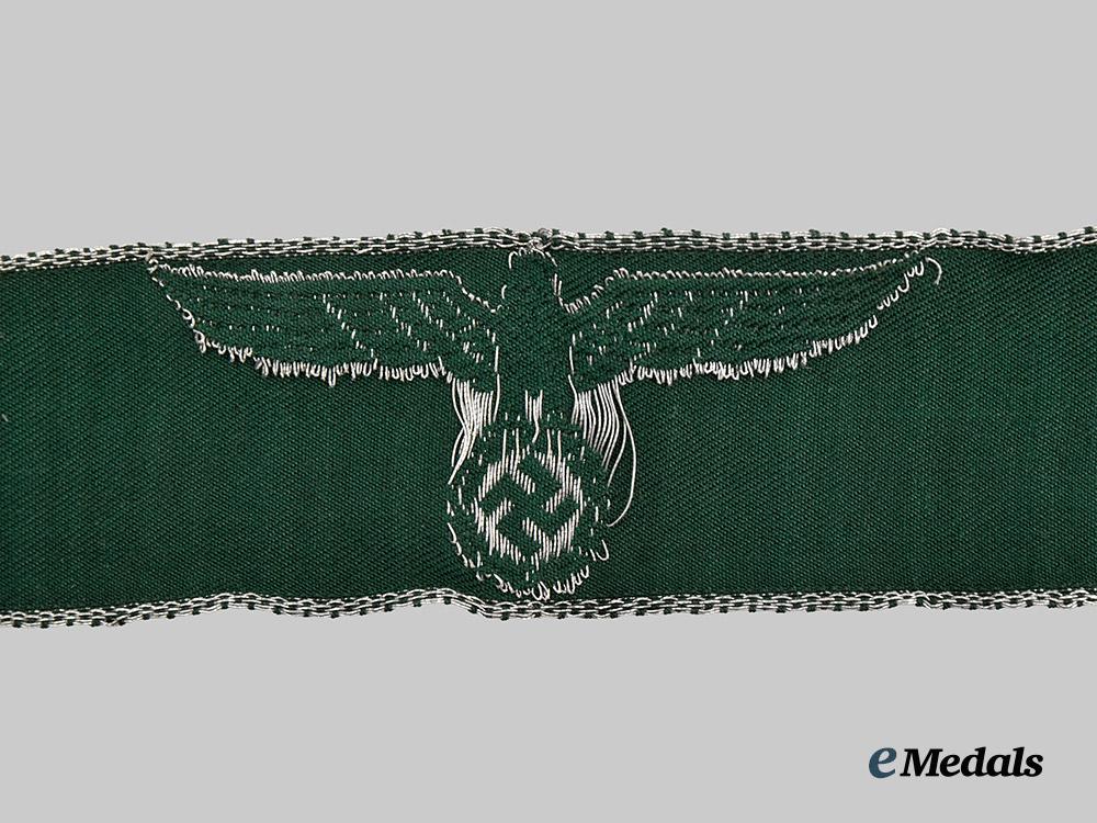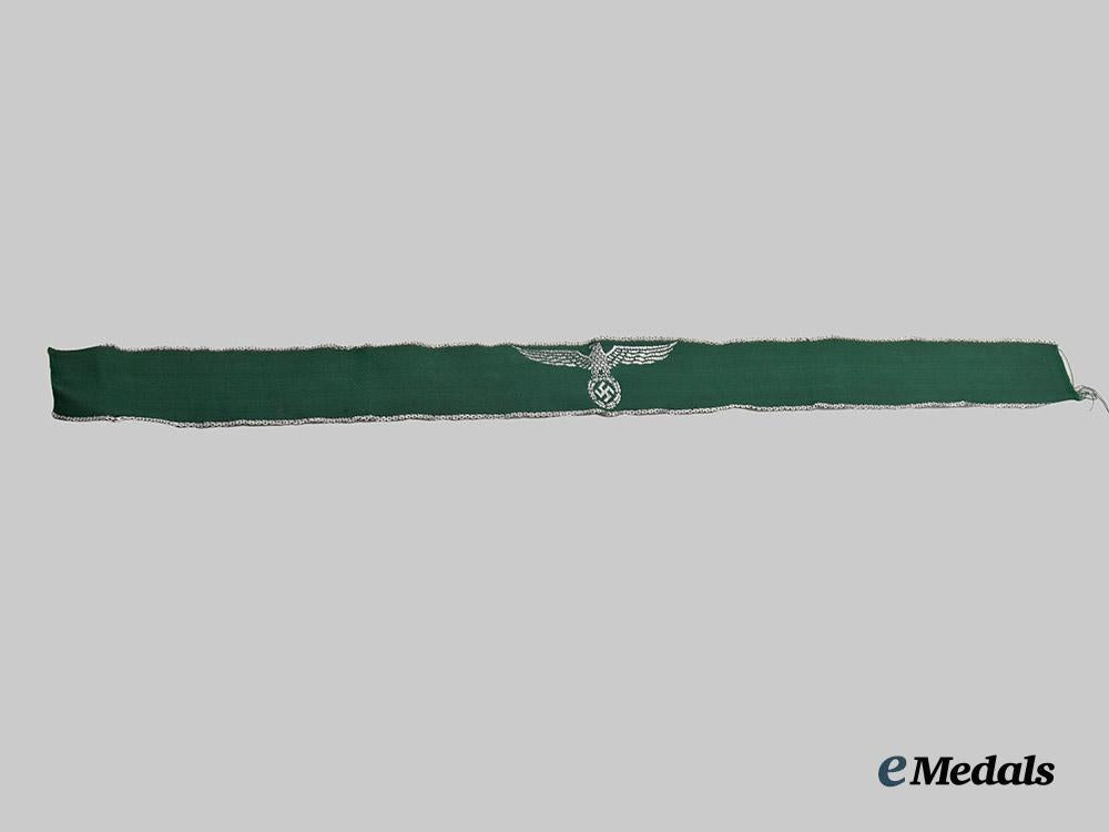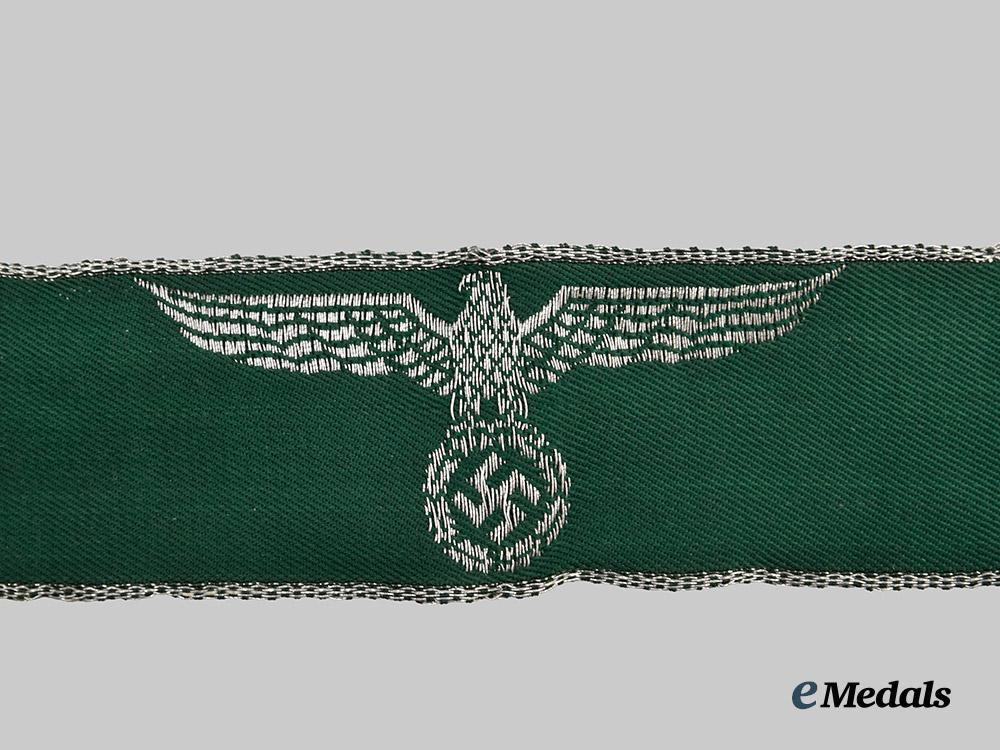 (Reichsfinanzverwaltung/Zollgrenzschutz Ärmelband). Constructed of green rayon, the obverse trimmed along both the top and bottom edges with machine-embroidered silver aluminum wire tresses, bearing a central customs-style German national eagle clutching a wreathed mobile swastika of identical construction, unmarked, measuring 30 mm (w) x 390 mm (l), in uniform-removed and extremely fine condition.