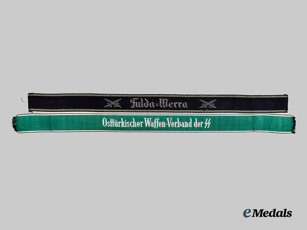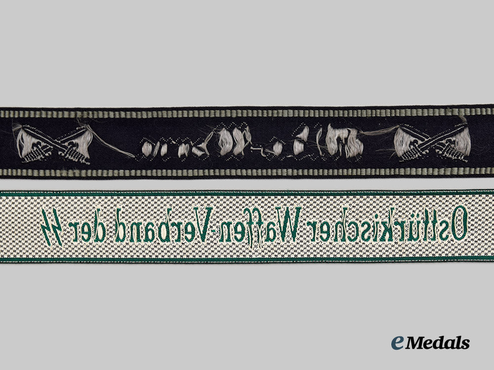 1. A Waffen-SS Osttürkischer Waffenverband volunteer’s cuff title, constructed of green rayon, the obverse trimmed along both the top and bottom images with white tresses, bearing a central machine-embroidered white inscription of “OSTTÜRKISCHER WAFFEN-VERBAND DER SS”, the reverse bearing a classic checkered pattern with a narrow sawtoothed white border trimming both the top and bottom edges, unmarked, measuring 30 mm (w) x 435 mm (l), in unissued and near mint condition.
