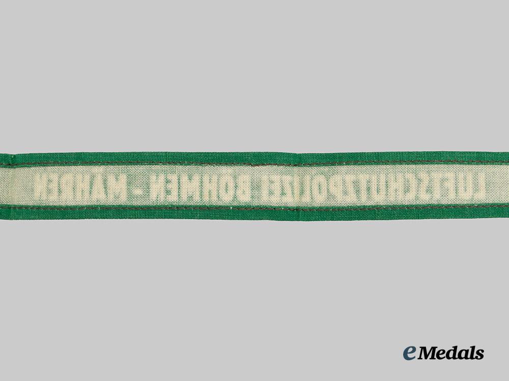(Ärmelband der Luftschutzpolizei Böhmen-Mähren). Constructed of a dyed green rayon blended cloth, the exterior bearing a white inscription of “LUFTSCHUTZPOLIZEI BÖHMEN-MÄHREN”, unmarked, measuring 25 mm (w) x 390 mm (l), an unissued example in near mint condition.