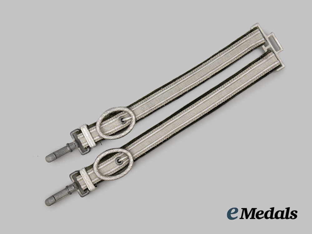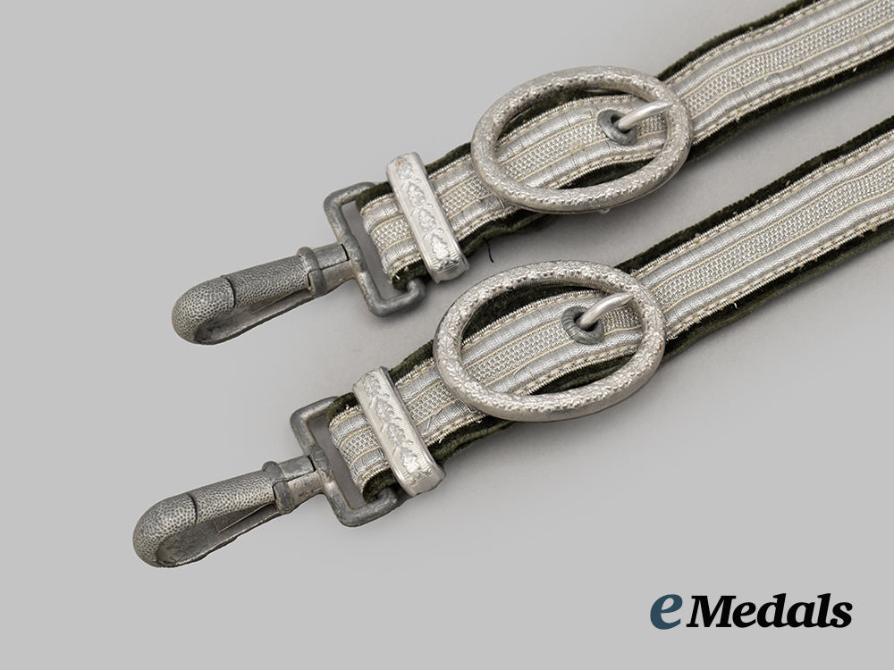 (Heer Dolchgehänge mit Etui). An exceptionally well-preserved Heer Officer’s dagger hanger, consisting of an aluminum loop with additional loops emanating from the lower edge, each accommodating a strap constructed of field-grey doeskin, topped by a silver aluminum wire tresse, both adjusted with function aluminum buckles taking the form of oval oak leaf wreaths, and culminating in functional silver alloy spring clips to lock onto the loops of a scabbard, unmarked, measuring 28 cm in total length as presented, accompanied by its original presentation case, of two-piece grey card stock construction, the lid bearing inscriptions of “DOLCHGEHÄNGE” and “HEERES-KLEIDERKASSE, BERLIN W 62 - BUDAPESTER STR. 28”, the interior retaining an original paper liner, measuring 7 cm (w) x 28 cm (l) x 2.5 cm (h), in unissued and near mint condition.