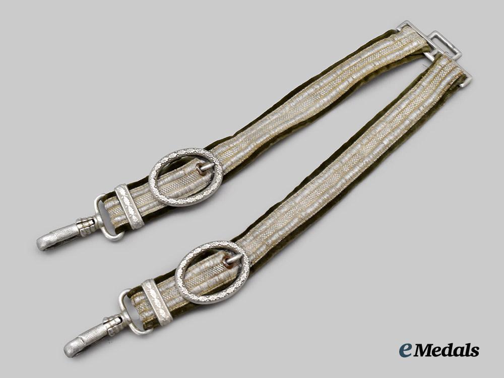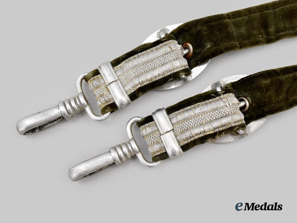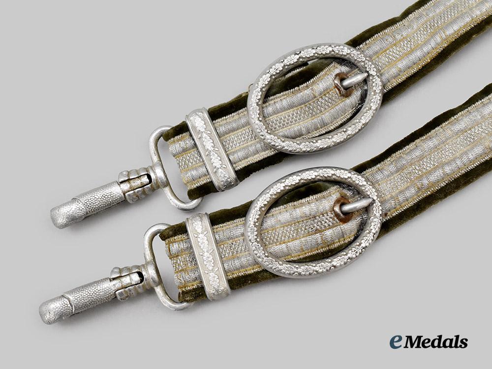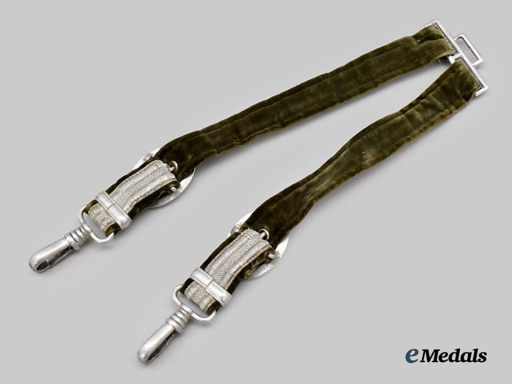 (Heer Gehänge für den Offiziersdolch). A Heer Officer’s dagger hanger, consisting of an aluminum loop with two additional loops emanating from the bottom edge, each in turn accommodating a field-grey doeskin strap topped by a silver aluminum wire tresses, each strap adjusted with a functional aluminum buckle taking the form of an oval oak leaf wreath and culminating in a functional spring clip to lock onto analogous scabbard loops, unmarked, measuring 27 cm in total length as presented, in extremely fine condition.