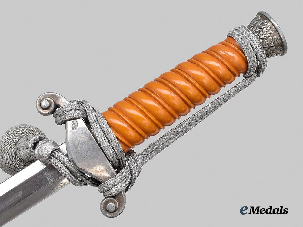 (Heer Dolch für Offiziere). A well-preserved Heer Officer’s dress dagger, measuring 39.5 cm in total length when inserted into the scabbard. It features a 26.5 cm-long, nickel-plated, magnetic steel blade which retains factory-original sharpening to both the edges and tip. The reverse ricasso bears a maker’s mark of “ORIGINAL EICKHORN, SOLINGEN”, surrounding the firm’s classic logo of a squirrel clutching a sword. The blade sits securely within a nickel-plated alloy crossguard, the obverse of which bears a raised Wehrmacht eagle clutching a wreathed mobile swastika, with an intact black leather buffer pad covering the seam. The handle grip is composed of a single piece of ribbed brown celluloid. It completes with a rounded pommel, bearing raised oak leaves around the outer circumference, which screws in to maintain the dagger’s structural integrity. Wrapped around the crossguard and pommel is a portepee consisting of a stylized silver aluminum wire acorn suspended from a cord of identical construction. Accompanying the dagger is its original scabbard, constructed of a pebbled magnetic metal shaft. Dual integral oak leaf bands are situated just below the throat, each retaining a loop for the accommodation of a hanger. A functional spring catch inside the throat firmly holds the dagger in place during storage. Minor issues consistent with age and wear are evident, and include running marks to the blade and some loss of nickel to the plated fixtures. The dagger remains in a near extremely fine condition.