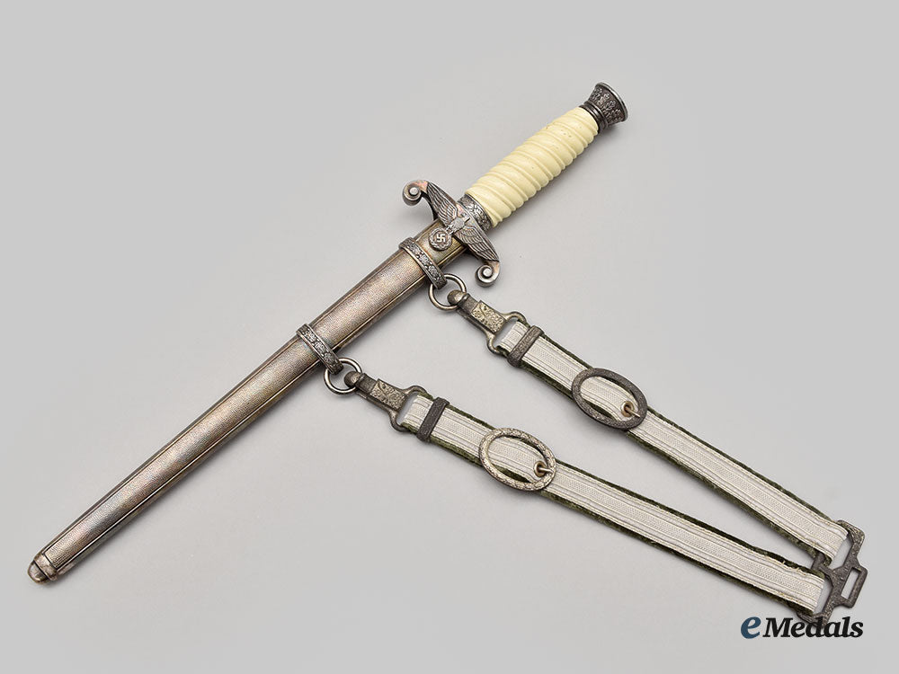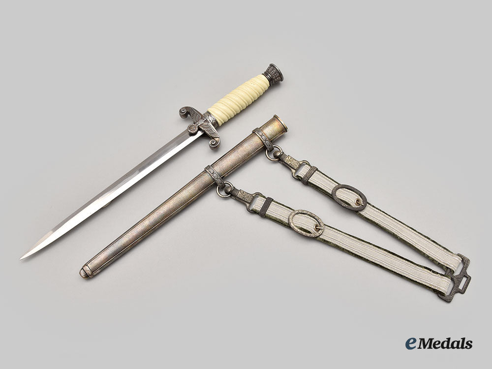 (Heer Dolch für Offizier mit Gehänge). An extremely well-preserved Heer Officer’s dress dagger, measuring 39 cm in total length when inserted into the scabbard. It features a 26 cm-long, nickel-plated, magnetic steel blade with gently sharpened tip and edges. The blade is plain with the exception of a maker’s mark on the reverse ricasso of “F.W. HÖLLER, SOLINGEN”, circumscribing the firm’s classic thermometer logo (with 17 ticks). The blade sits securely within a nickel-plated crossguard, the obverse of which bears a raised Wehrmacht eagle clutching a wreathed mobile swastika, with the seam covered by an intact black leather buffer pad. The handle grip is composed of a single piece of ribbed off-white celluloid, and the dagger completes with a rounded pommel bearing raised oak leaves around the outer circumference, screwing in to maintain the dagger’s structural integrity. It is accompanied by its original scabbard, constructed of a pebbled magnetic metal shaft. The upper third of the shaft has dual integral oak leaf bands with loops for the accommodation of a hanger. The throat retains a functional spring catch to firmly hold the dagger in place during storage. Minor issues consistent with age and wear are evident, and include slight running marks to the blade, scratching of the handle grip, and a consistent patina throughout the nickel-silver and metal elements. It remains in an extremely fine condition.