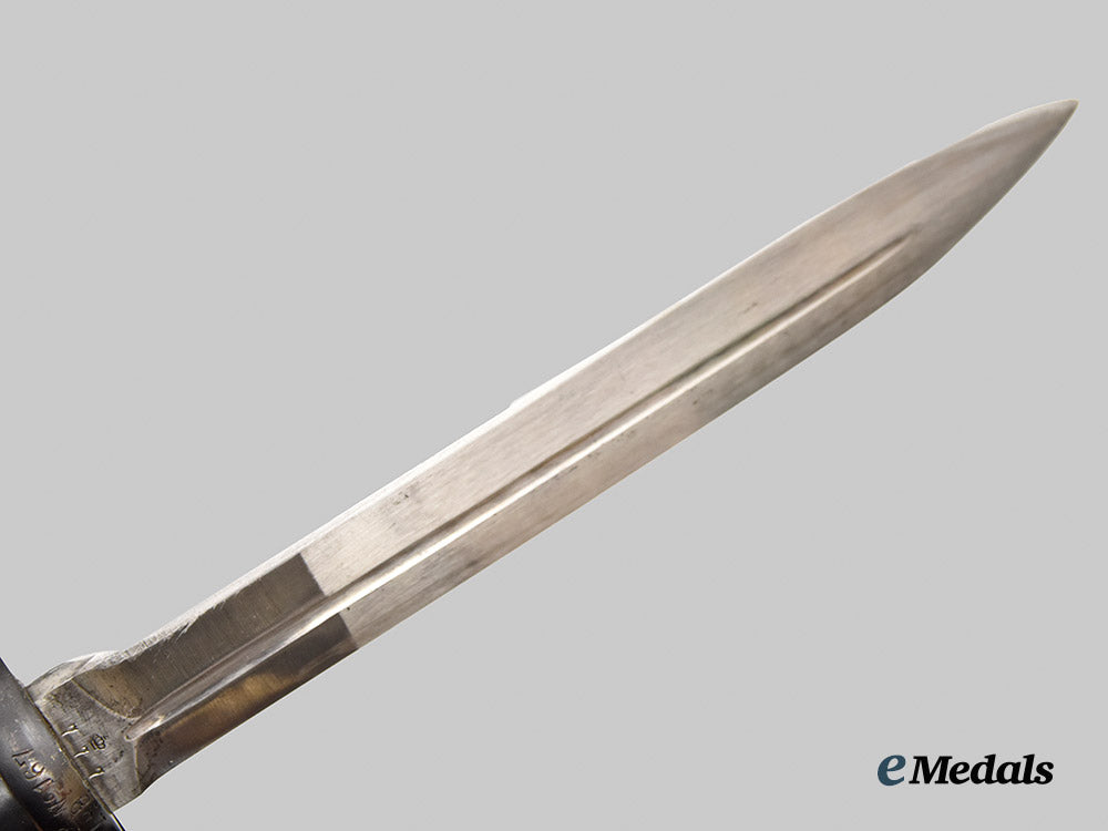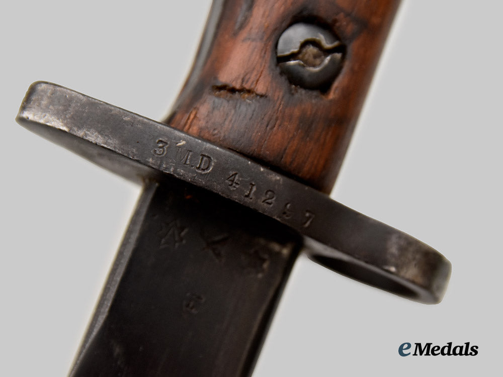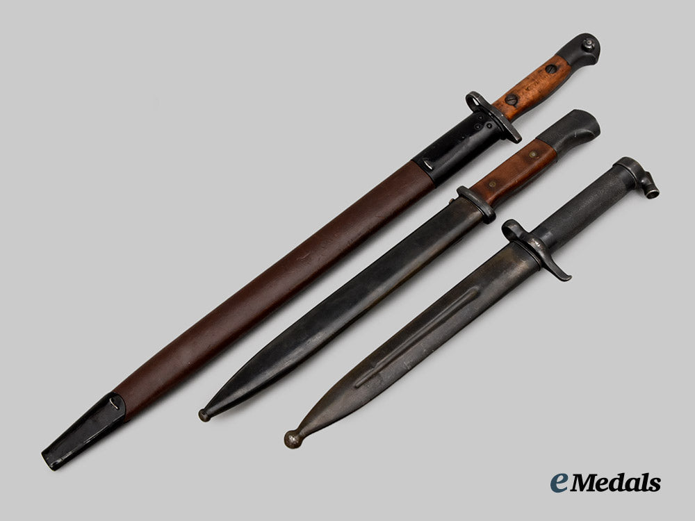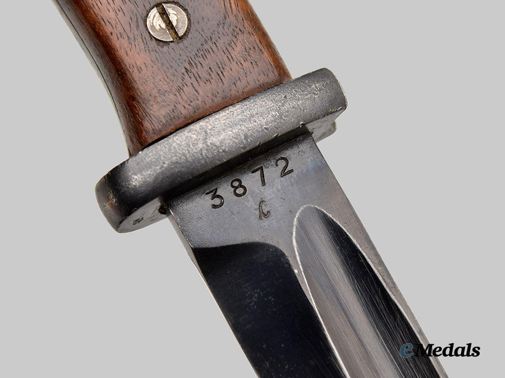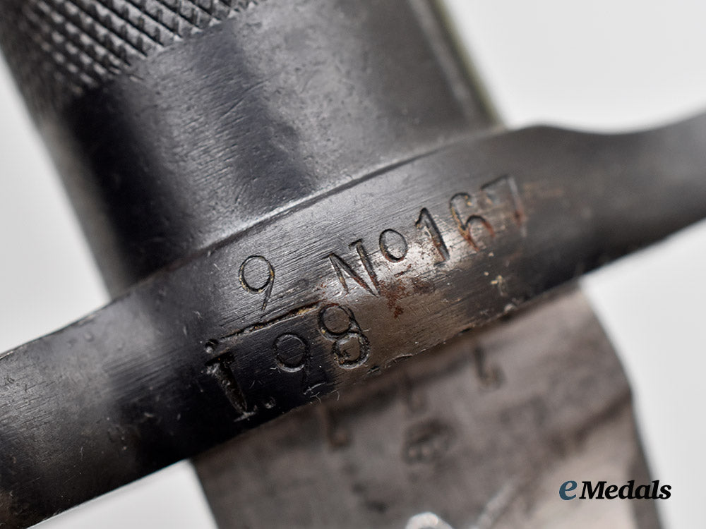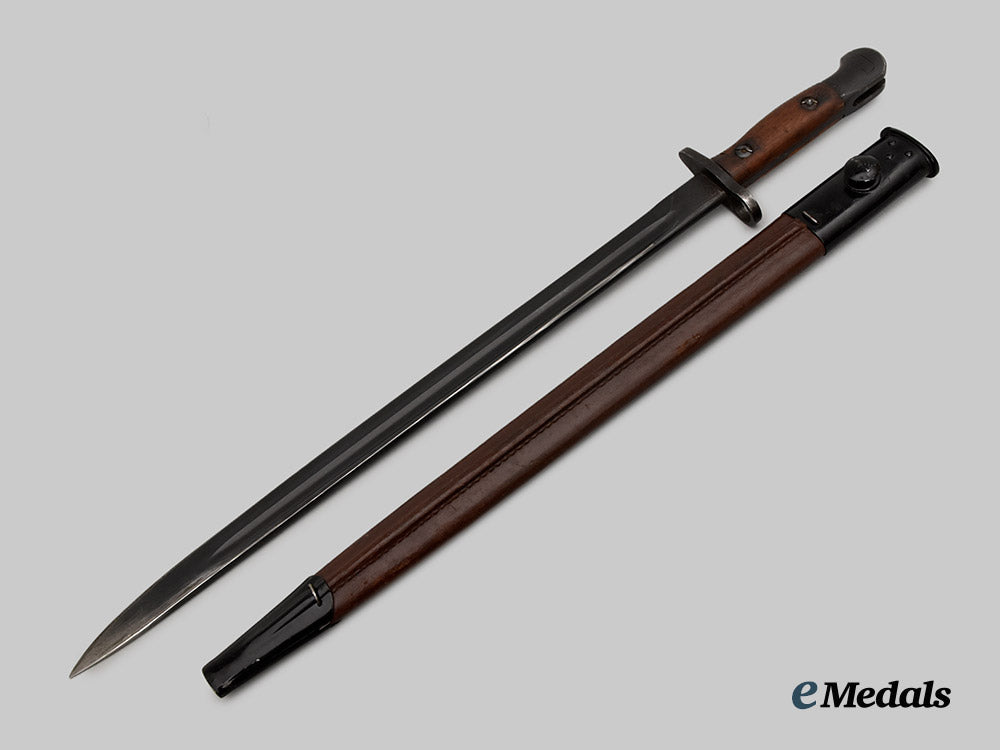 2. An Australian P1907 SMLE bayonet, measuring 58 cm in total length when inserted into the scabbard. It features a 43 cm-long magnetic steel blade with a sharpened tip and lower edge. Retaining the majority of its original blueing, the blade has wide fullers which run the majority of the length of each side. Stamped onto the reverse ricasso is a maker’s mark of “LITHGOW” for the famous Australian state arms factory, with a manufacture date of “1916”, while the obverse ricasso bears government inspection marks and factory codes. The blade sits securely within a blued magnetic metal hilt, with a crossguard stamped with a serial number and featuring a barrel hole. A hollow insertion slot is set into the pommel and has a functional push-button spring release, stamped with a rifle number of “50402” for its corresponding firearm. Two pieces of dark brown wood comprise the handle grip, and are secured in place with dual magnetic metal rivets. Carefully carved into the reverse of the handle is a mark of “AUSTRALIA”. The blade is accompanied by its matching Second World War re-issue scabbard, constructed of a boiled brown leather shaft. The shaft bears an embossed mark of “MANGROVITE 44”. Blackened magnetic metal fixtures are secured to both the tip and throat, with a stud emanating from the latter for the accommodation of a frog. Minor issues consistent with age and field use are evident, and include some running marks to the blade with corresponding dulling of the edges, in addition to slight material fatigue of the scabbard. A superb example of a First World War bayonet repurposed for Second World War use, it remains in a near extremely fine condition.