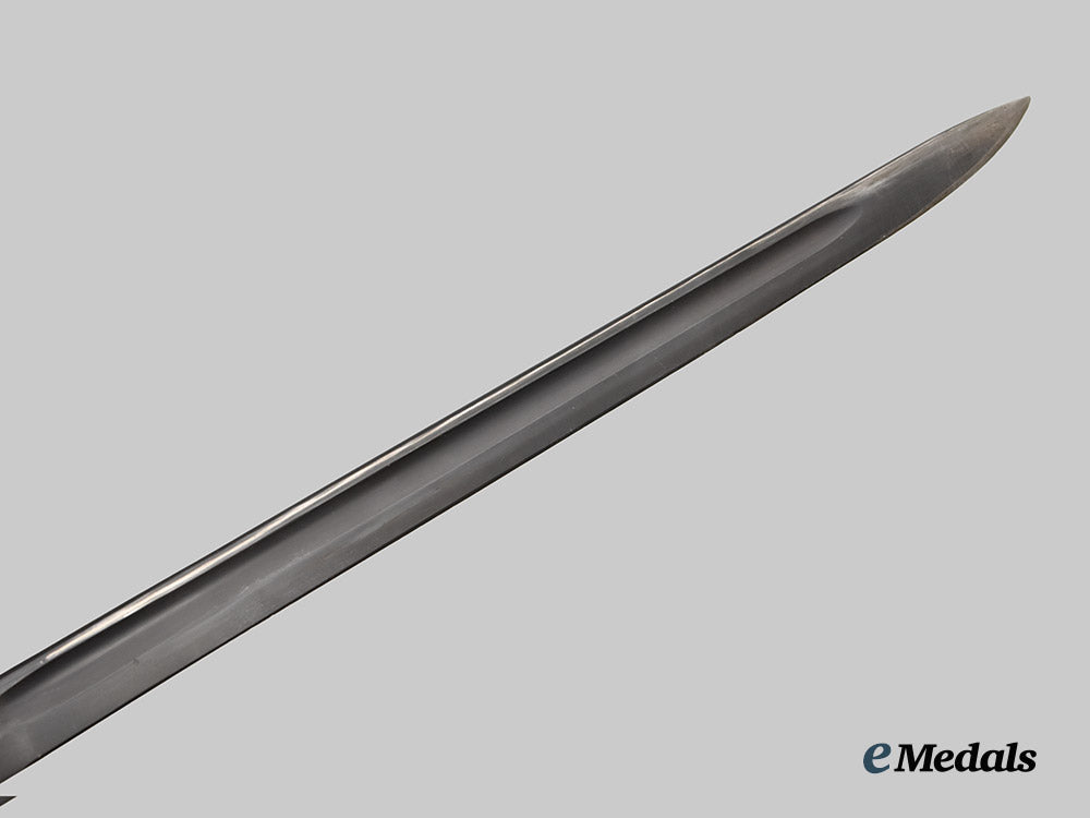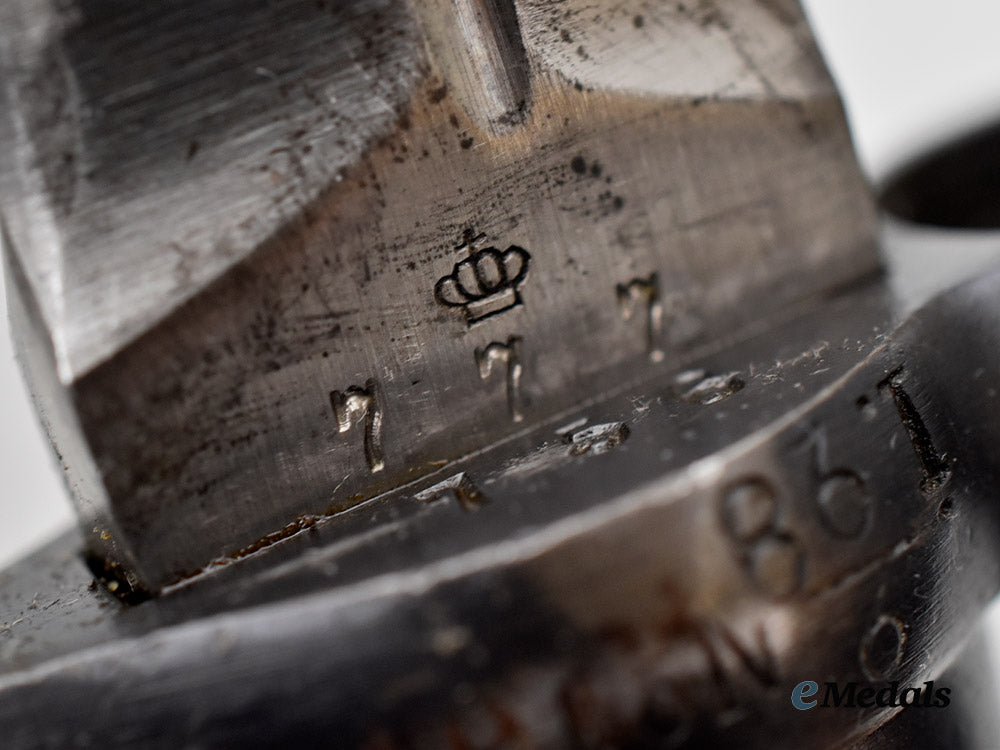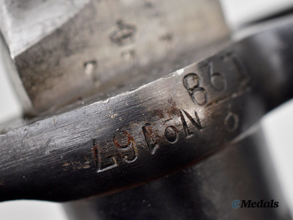 3. A Swedish Mauser bayonet, measuring 35 cm in total length when inserted into the scabbard. It features a 21 cm-long magnetic steel blade with a sharpened tip and lower edge. A narrow fuller runs the majority of the length of the mid-section of both sides of the blade. The ricasso is stamped on both the obverse and reverse with government acceptance marks and a serial number. The blade sits securely within a multi-piece blued magnetic steel hilt. The crossguard features a barrel hole, additional numerical code, and maker’s mark of the Eskilstuna Iron Company, and unit attribution. A pebbled handle culminates in a hollow insertion slot set into the pommel. The bayonet is accompanied by its original scabbard, constructed of a blued magnetic metal shaft. A flattened stud emanates from the side of the shaft just beneath the throat, indicating an early issue example. The throat bears an additional maker’s mark of “E.A.B.” for Erik Anton Berg, Eskilstuna. Minor issues consistent with age and field use are evident, and include some running marks to the blade and surface oxidation of the metal features. It remains in a near extremely fine condition.