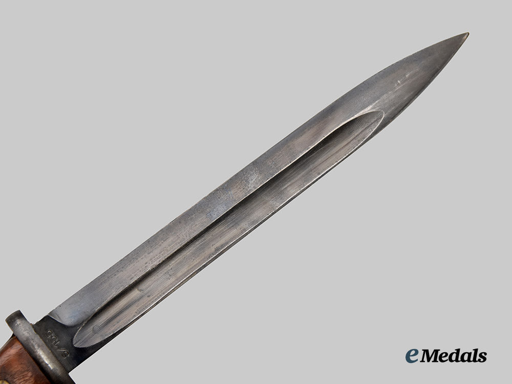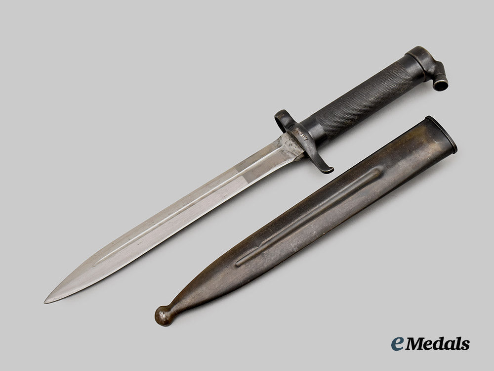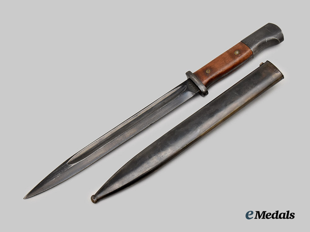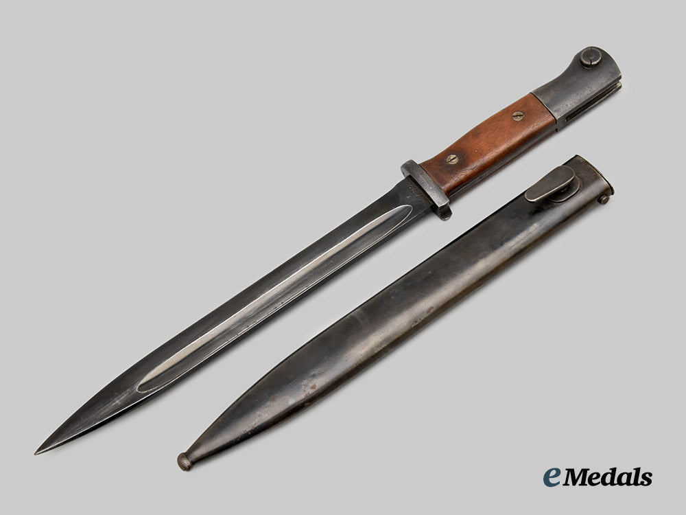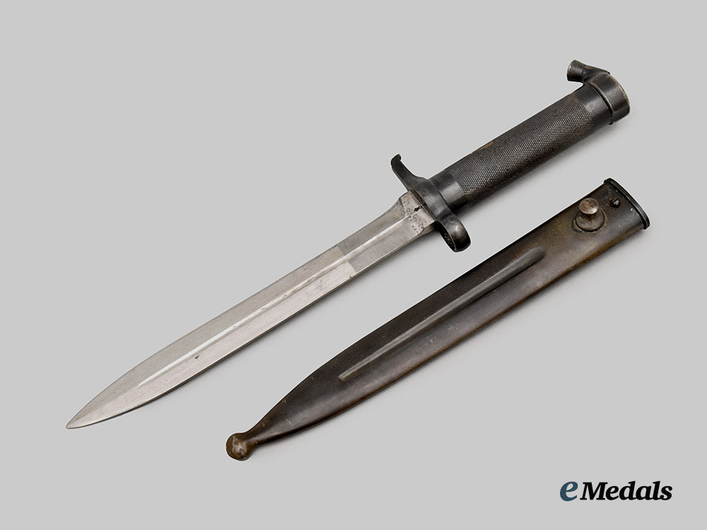 1. A well-preserved German Heer (Army) K98 combat bayonet, measuring 40 cm in total length when inserted into the scabbard. It features a 25 cm-long magnetic steel blade with a sharpened tip and lower edge. Retaining most of its original blueing, the blade has wide fullers running the majority of the length of the top edge of each side. Both the obverse and reverse of the ricasso are stamped with serial numbers and depot codes. The blade sits securely within a blued magnetic metal hilt, with a hollow insertion slot set into the pommel, itself retaining a functional push-button spring release. Two pieces of ribbed dark brown wood compose the handle grip, and are secured together with dual magnetic metal rivets. Partially-legible Waffenamt marks are visible on the reverse pommel. It is accompanied by its original scabbard, constructed of a blued magnetic metal shaft. A downward-pointing hook emanates from the side of the shaft directly below the throat for the inclusion of a frog, while a functional spring catch within the throat firmly holds the bayonet in place during storage, and is fastened in place with a single side rivet. The obverse of the shaft is stamped with a mis-matched serial number along the rim of the throat, while the analogous spot on the reverse bears a maker’s mark of “F. HERDER A. SN”, with a manufacture date of “1939”. Minor issues consistent with age and field use are evident, and include minor running marks to the blade and sporadic, shallow denting to the scabbard shaft. The bayonet remains in an extremely fine condition.