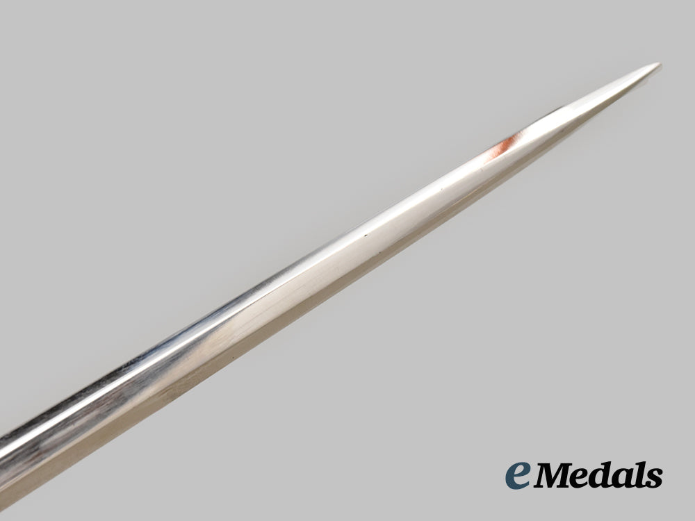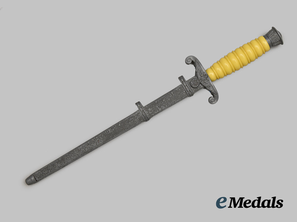 (Heer Miniatur Offiziersdolch). An example of a Wehrmacht Officer’s store exhibition dagger used by salesmen, measuring 19 cm in total length when inserted into the scabbard. It features an approximately 128 mm long, nickel-plated, magnetic metal blade with a sharpened tip and slightly sharpened edges. It sits securely within a silvered zink crossguard, with the obverse bearing a raised Wehrmacht eagle clutching a wreathed mobile swastika. The handle grip is composed of a single piece of ribbed brown celluloid, while the dagger completes with a rounded and silvered zink pommel. It is accompanied by its original scabbard, constructed of a pebbled and silvered shaft with a magnetic metal core. The upper third of the shaft has two integral oak leaf bands for the accommodation of a hanger. Loss of finish is evident to the zink fixtures, but the dagger remains in an extremely fine condition.
