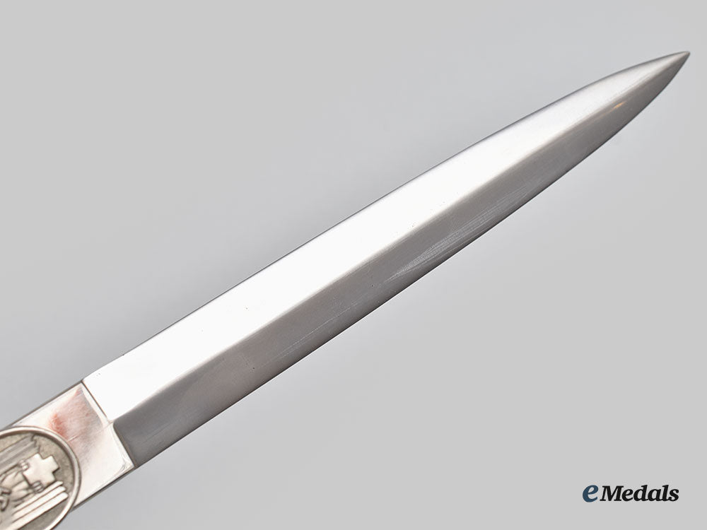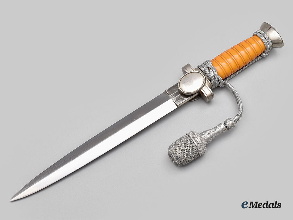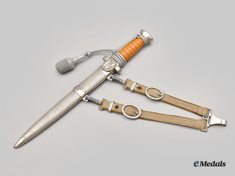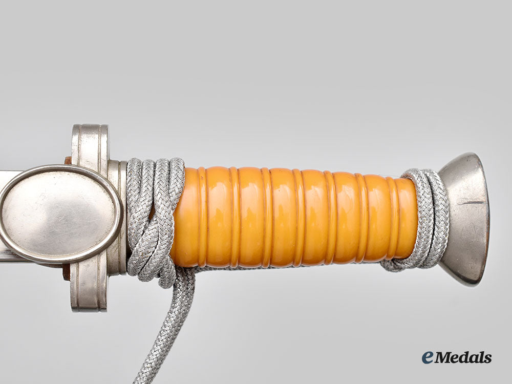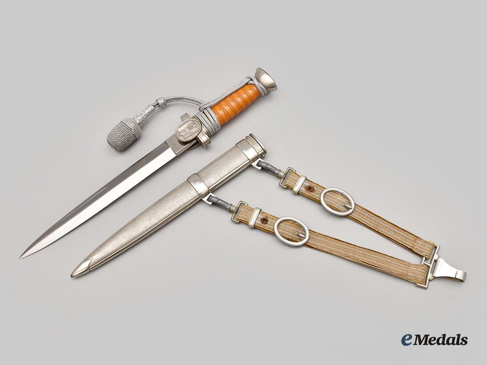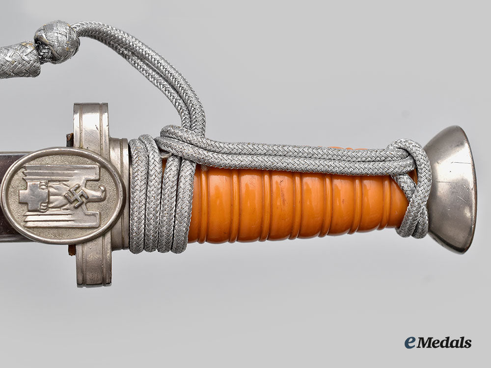 (Deutsches Rotes Kreuz Führerdolch). A well-preserved Deutsches Rotes Kreuz (German Red Cross/DRK) Leader’s Dagger, measuring 38 cm in total length when inserted into the scabbard. It features a 25 cm-long, nickel-plated, magnetic steel blade with a sharpened tip and edges. Fully unmarked, the blade sits securely within a nickel-plated alloy crossguard which has double-sided oval medallions, with the obverse bearing a raised DRK insignia in the form of a German national eagle clutching a Geneva cross and overlaid by a mobile swastika. The handle grip is composed of a single piece of ribbed light brown celluloid, while the dagger completes with a flattened pommel with a screw that maintains the dagger’s structural integrity. Wrapped around the handle is a matching portepee consisting of a stylized silver aluminum wire acorn suspended from a strap of identical construction. It is accompanied by its original scabbard, constructed of a pebbled magnetic metal shaft. The upper third of the shaft has two integral bands with loops for the accommodation of a hanger. The throat retains a functional spring catch to firmly hold the dagger in place during storage. Minor issues consistent with age and wear are evident, and include some running marks to the blade and loosening of the hilt not mitigated by tightening the screw. The dagger remains in a near extremely fine condition.