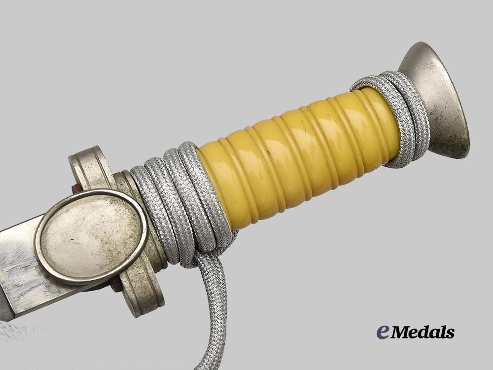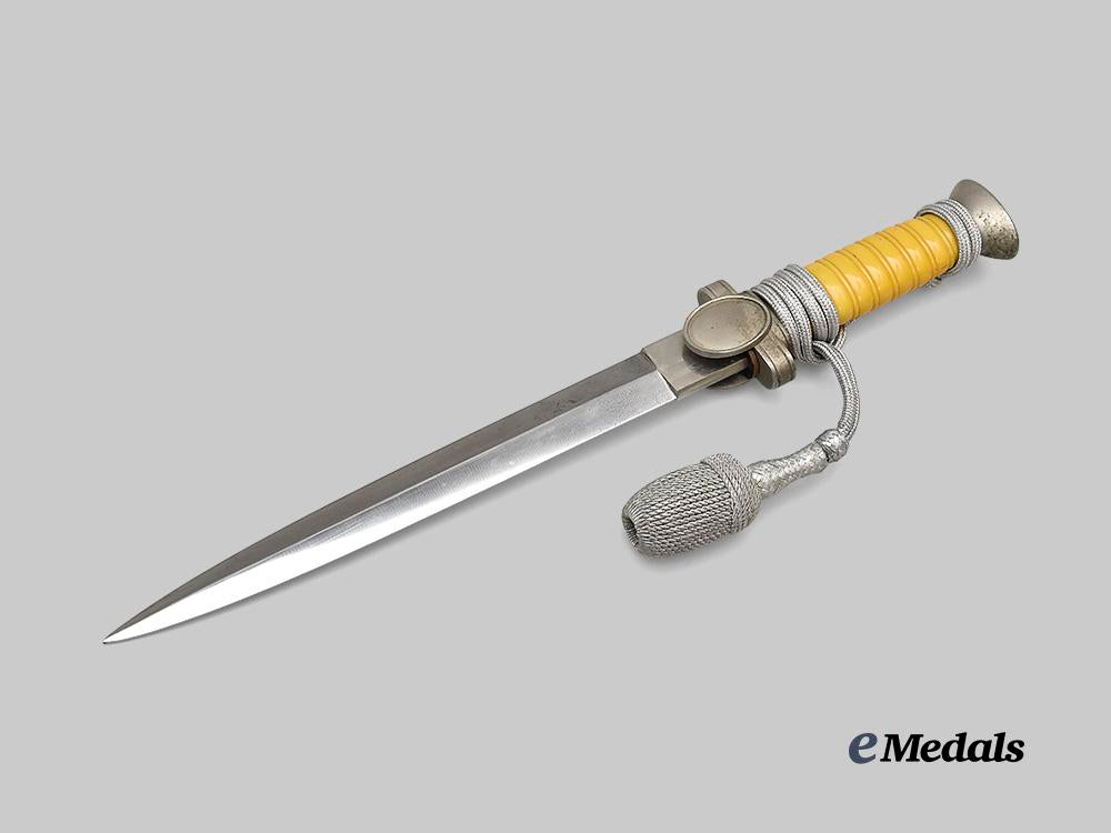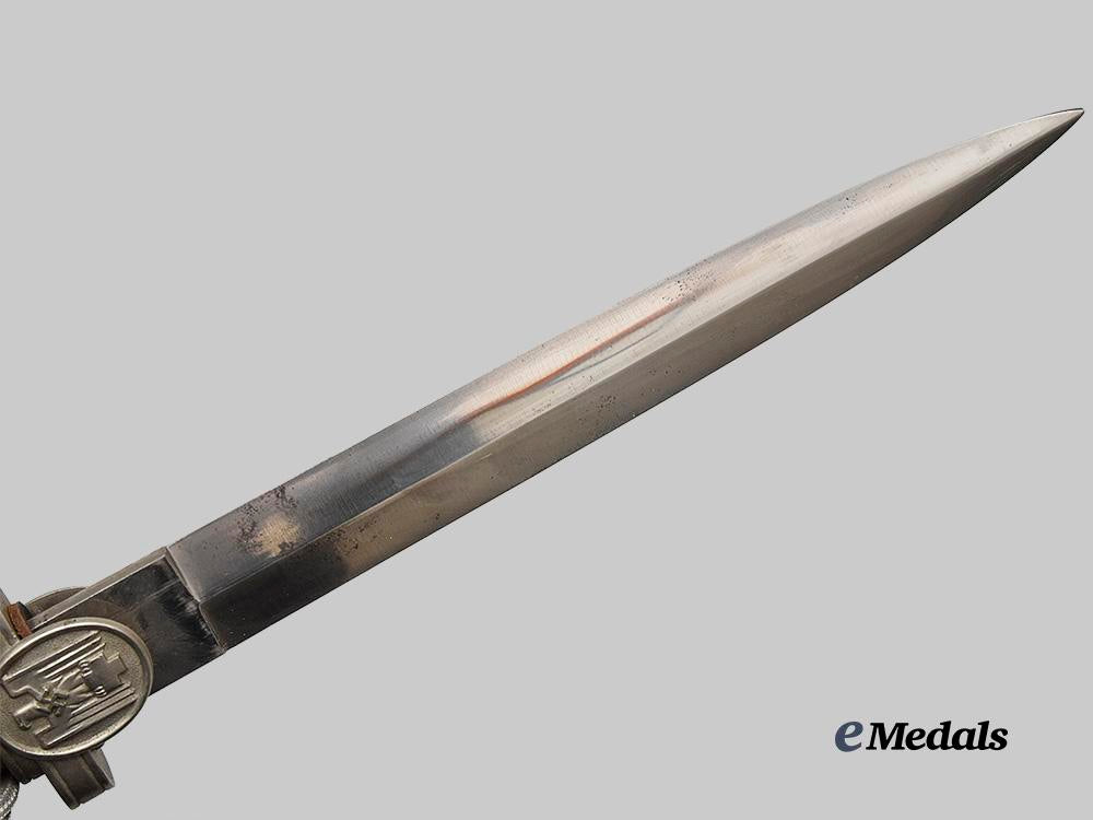 (Deutsches Rotes Kreuz Dolch für Führer mit Gehänge). A Deutsches Rotes Kreuz (German Red Cross/DRK) Leader’s Dagger, measuring 38 cm in total length when inserted into the scabbard. It features a 25 cm-long, nickel-plated, magnetic steel blade which retains factory-original sharpening to both the edges and tip. Fully unmarked, the blade sits securely within a multi-piece hilt, featuring a nickel-plated crossguard bearing double-sided oval medallion, with the obverse bearing a raised DRK-style German national eagle. An intact blackened leather buffer pad covers the seam where the dagger meets the hilt. A single piece of ribbed light brown celluloid composes the handle grip, while the dagger culminates in a wide, flattened pommel which retains an original pommel screw. Wrapped around the handle is a period portepee, consisting of a stylized silver aluminum wire acorn suspended from a cord of identical construction. Accompanying the dagger is its original scabbard, constructed of a pebbled and nickel-plated magnetic metal shaft. Two integral bands situated at the upper third of the shaft feature rectangular loops for the addition of a hanger, while a functional catch within the throat firmly holds the dagger in place during storage. Issues consistent with age and wear are evident, and include some running marks tarnishing to the blade, loss of nickel plating to the crossguard and pommel, and significant loosening of the handle grip which rendered insertion and extraction of the blade from the scabbard difficult. This rare Leader-grade dagger remains in a very fine condition.