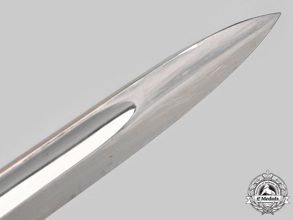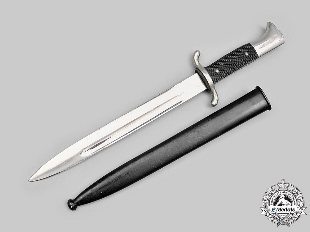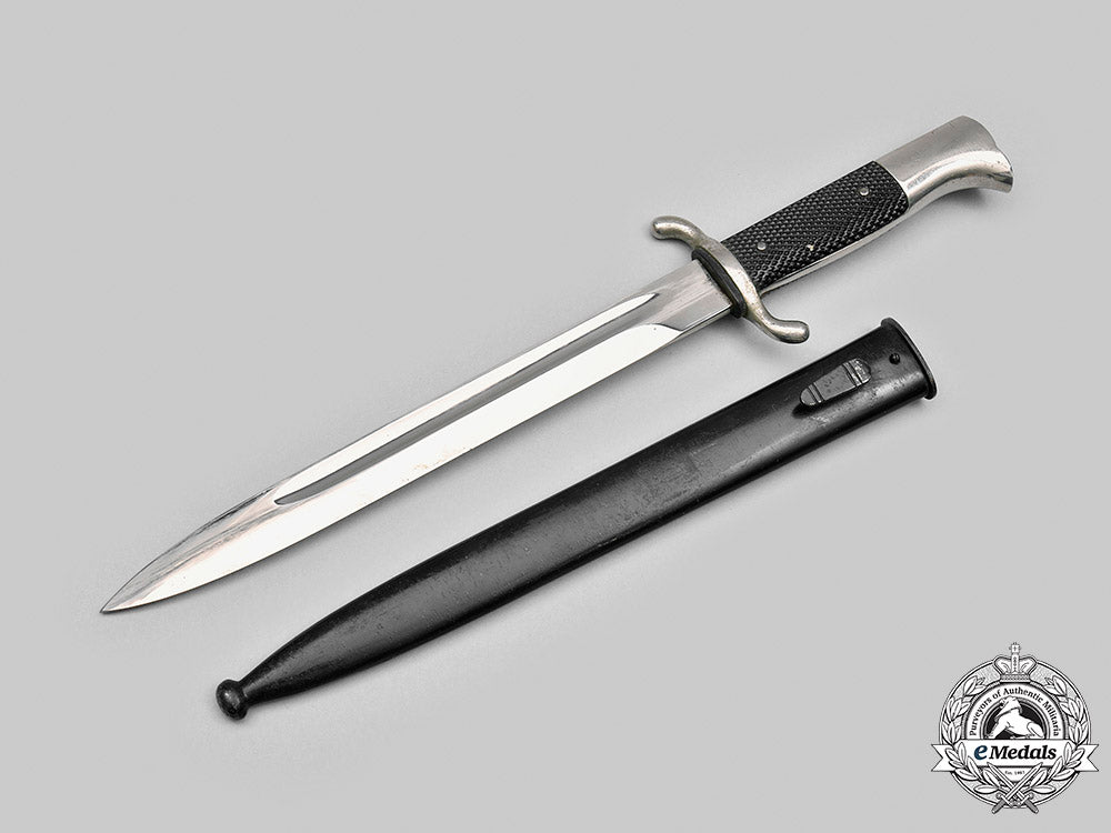 (Feuerschutzpolizei Offiziersdolch). A well-preserved Feuerschutzpolizei Officer’s dress bayonet, measuring 405 mm in total length when inserted into the scabbard. It features a 250 mm-long magnetic metal blade with a sharpened tip and semi-sharpened lower edge, and with fullers running the length of each side. The blade sits securely within a nickel-plated upper crossguard, presenting with hooked quillons, which transitions into a one-piece hilt. The seam of the blade and crossguard is covered by a fully intact black leather buffer pad. Two pieces of pebbled black bakelite comprise the handle grip, and are secured in place with dual magnetic metal rivets. As a dress uniform accessory, the bayonet does not have an insertion slot. It is accompanied by its period original scabbard, constructed of a black-painted magnetic metal shaft. Emanating from the side of the shaft is a downward-pointing hook for optional attachment to a frog. The throat retains a functional spring catch, securely holding the bayonet in place during storage. It is secured together by a single visible side rivet. Unmarked, the bayonet demonstrates only minor signs of age and use, including slight running marks to the blade and some oxidation of the nickel-plated and magnetic metal features. It is in an overall near extremely fine condition