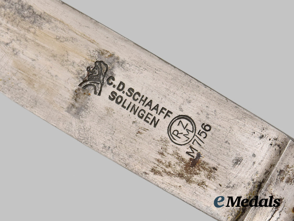 (HJ Fahrtenmesser). An HJ member’s knife, measuring 25.5 cm in total length when inserted into the scabbard. It features a 14 cm-long, nickel-plated, magnetic steel blade with a sharpened tip and lower edge. Acid-etched onto the obverse is an inscription of “BLUT UND EHRE!” (“BLOOD AND HONOUR!”). A transitional example, the reverse of the blade is maker marked “C.D. SCHAAFF, SOLINGEN”, flanked by the firm’s fisherman logo, in addition to a Reichszeugmeisterei (RZM) logo and maker code “M7/56” for the same manufacturer. The blade sits securely within a one-piece, nickel-plated, magnetic steel hilt with a hooked quillon and pommel, with an intact blackened leather buffer pad covering the seam. Two pieces of pebbled black bakelite compose the handle grip and are secured together with dual magnetic metal rivets. Inset into the obverse of the handle is an enameled HJ insignia measuring 15 mm (w) x 25 mm (h). The knife is accompanied by its original scabbard, constructed of a black-painted magnetic metal shaft. Riveted to the reverse is a black leather strap, stitching into a loop for belt suspension, with a functional snap button to hold the knife in place during storage. Issues consistent with age and wear are evident, and include some tarnishing and running marks to the blade, in addition to some chips to bottom edge, with a large chip visible to the obverse handle grip and some wear to the scabbard. The knife remains in a very fine condition.