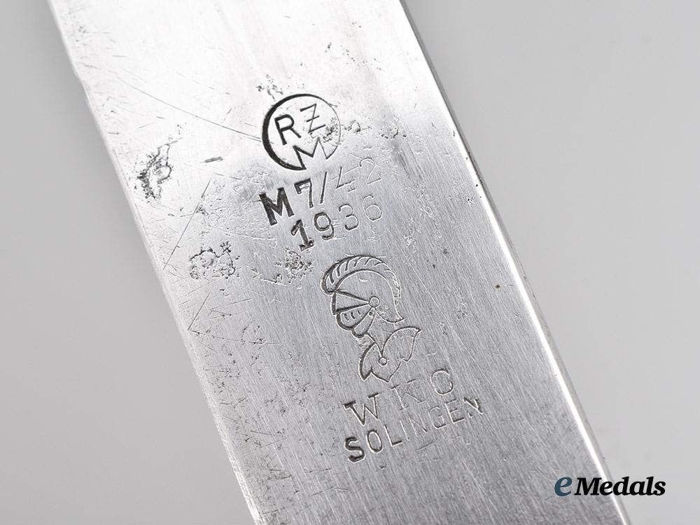 (HJ Fahrtenmesser). A well-preserved HJ member’s knife, measuring 25.5 cm in total length when inserted into the scabbard. It features a 14 cm-long, nickel-plated, magnetic steel blade which retains some factory-original sharpening to the lower edge. Acid-etched onto the obverse is an inscription of “BLUT UND EHRE!” (“BLOOD AND HONOUR!”) in cursive script. The reverse bears transitional maker marks consisting of the classic knight’s helmet logo of the firm of Weyersberg, Kirschbaum & Cie, Solingen, topped by a Reichszeugmeisterei (RZM) logo and maker code “M7/42” for the same, with a manufacture date of “1936”. The blade sits securely within a nickel-plated magnetic steel hilt with a hooked quillon and pommel with an intact blackened leather buffer pad covering the seam. Two pieces of pebbled black bakelite compose the handle grip, and are fastened in place with dual metal rivets. Inset into the obverse of the handle is an enameled HJ insignia measuring 15 mm (w) x 25 mm (h). Accompanying the knife is a matching scabbard, constructed of a black painted magnetic metal shaft. Riveted to the reverse is a blackened leather strap configured into a loop for belt suspension, which also retains a functional snap button to hold the knife in position during wear. A functional spring catch situated within the throat firmly holds the blade within the scabbard. Issues consistent with age and wear are evident, and include blunting of the tip, running marks, scratching, and sporadic chipping to the blade, minor fatigue of the hanger, and friction which impacts insertion and extraction of the blade from the scabbard. This transitional example remains in a better than very fine condition.