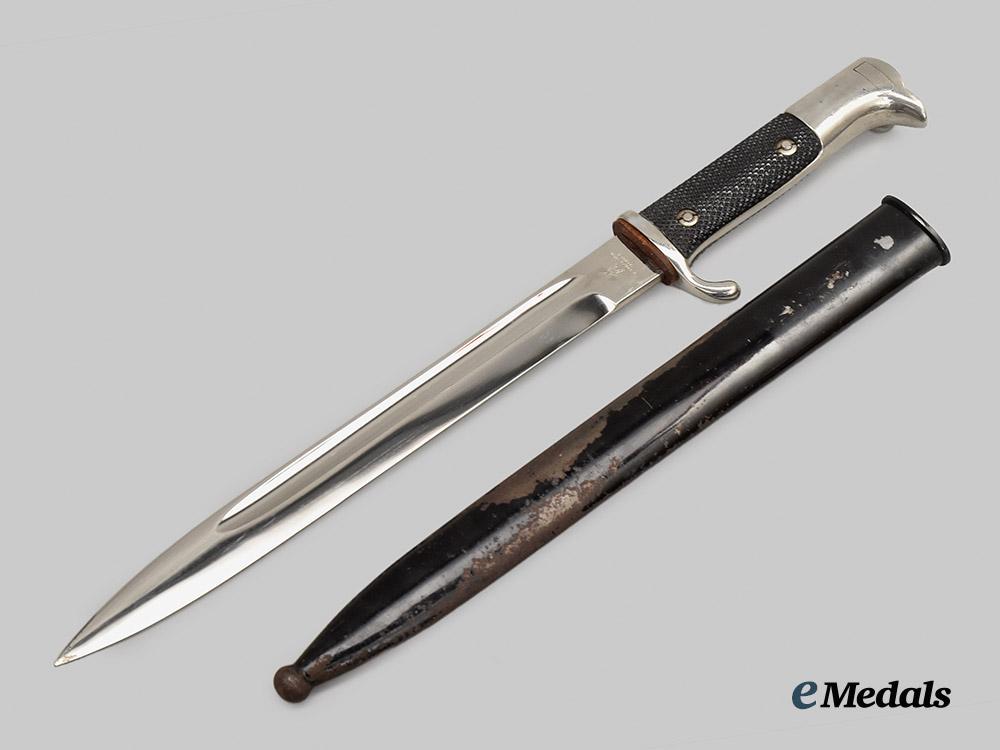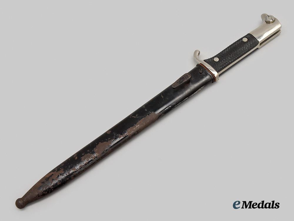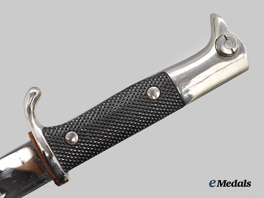 (Luftwaffe Bajonett). A well-preserved Luftwaffe commemorative dress bayonet, measuring 40 cm in total length when inserted into the scabbard. It features a 25 cm-long, nickel-plated, magnetic steel blade which retains some factory-original sharpening to the tip and lower edge. A wide fuller runs the majority of the length of the upper edge of each side. The obverse bears an acid-etched inscription of “ZUR ERINNERUNG AN MEINE DIENSTZEIT” (“IN MEMORY OF MY SERVICE TIME”), flanked by a Stahlhelm and Luftwaffe eagle clutching a mobile swastika. The reverse ricasso bears a maker’s mark of “E. PACK & SÖHNE, SOLINGEN”. It sits securely within a nickel-plated alloy hilt with a hooked quillon and pommel, and with a hollow insertion slot set into the pommel retaining a functional push-button spring release. An intact black leather buffer pad covers the seam where the blade enters the hilt. Two pieces of pebbled black bakelite compose the handle grip, and are secured in position with dual magnetic metal rivets. Accompanying the bayonet is its original scabbard, constructed of a black painted magnetic metal shaft. A downward-pointing hook emanates from the side of the shaft for the accommodation of a frog. A functional spring catch situated within the throat firmly holds the bayonet in place during storage. Issues consistent with age and wear are evident, and include some blunting of the tip, scratching and running marks to the blade, and moderate loss of paint to the scabbard shaft. The bayonet remains in an overall better than very fine condition.