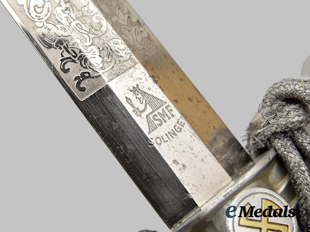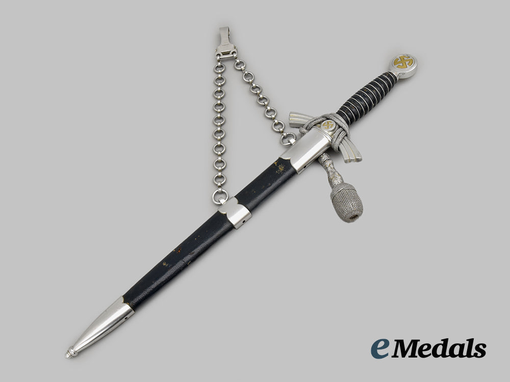 (Luftwaffe Fliegerdolch). An extremely well-preserved Luftwaffe Flyer’s Dagger, measuring 49 cm in total length when inserted into the scabbard. It features a 31 cm-long, nickel-plated, magnetic steel blade with a sharpened tip and unspoiled edges. Acid-etched onto the obverse scabbard is an owner’s name of “ROLF GROßMANN”, flanked on each side by intricate arabesque latticework which directs the viewer’s attention to the inscription. The reverse bears an acid-etched, first pattern, droptail-style Luftwaffe eagle clutching a mobile swastika, similarly situated within arabesque latticework. The reverse ricasso is maker marked with the classic seated king Solinger Metallwaren-Fabrik (SMF) logo of Stöcker & Co., Solingen. The blade sits securely within an aluminum crossguard, taking the form of a pair of downward-pointing wings, featuring double-sided central gilt sunwheel-style mobile swastikas. Wrapped around the crossguard is a matching portepee, consisting of a stylized silver aluminum wire acorn suspended from a cord of identical construction. The handle grip is composed of a sturdy wooden core fully lined on the exterior with a ribbed dark blue Moroccan leather liner, with the ribbing retaining an original twisted and rolled wire cord. It completes with a rounded aluminum pommel, bearing double-sided gilt sunwheel-style mobile swastikas, screwing in to maintain the dagger’s structural integrity. It is accompanied by its original scabbard, constructed of a magnetic metal shaft and fully lined on the exterior with a dark blue Moroccan leather liner. Aluminum fixtures are secured to the tip, mid-section, and throat with side rivets. Emanating from the latter two are integral loops retaining rings, in turn accommodating two chain links which culminate in a functional spring clip for uniform suspension. The throat retains a functional catch to firmly hold the dagger in place during storage. Minor issues consistent with age and wear are evident, and include some runnins marks to the blade, with moderate fatigue of the leather liners. A scarce owner-attributed example in near extremely fine condition.