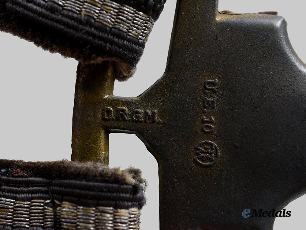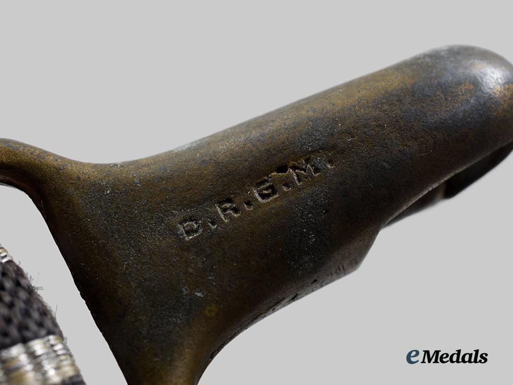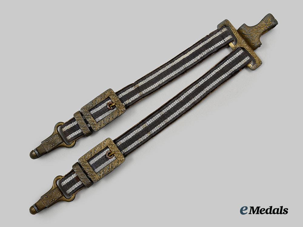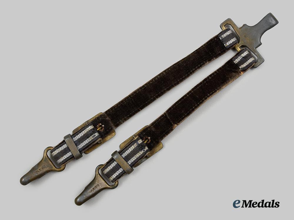 (Luftwaffe Dolch-Gehänge für General). A well-preserved Luftwaffe General’s dagger hanger, consisting of a functional gilded zink alloy spring clip decorated with raised oak leaves, with dual loops of identical construction emanating from the lower edge, each accommodating a strap constructed of a slate-grey doeskin base topped by a layer of rayon threading executed in identical colouring, both trimmed along the edges with machine-embroidered silver aluminum wire piping, fastened with gilded zink alloy buckles for adjustable suspension, completing with functional spring clips to lock onto a matching dagger’s scabbard loops, marked with a Reichszeugmeisterei (RZM) logo flanked by a code of “U.E. 10”, measuring 28.5 cm in total length as presented, demonstrating moderate loss of gilt finish throughout the metal elements, in near extremely fine condition.