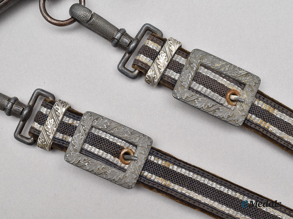 Accompanying the dagger is a matching hanger, consisting of a functional non-magnetic metal spring clip with two loops emanating from the lower edge. Descending from each loop is a strap constructed of slate-grey doeskin, topped by dark grey rayon and trimmed with machine-embroidered silver aluminum wire tresses. Each strap is adjusted with a zink buckle and completes with a functional spring clip to lock onto the scabbard’s loops. Unmarked, it measures 30 cm in total length. Loss of finish is visible to the metal fixtures and the straps demonstrate minor material fatigue, but it remains in an overall near extremely fine condition.