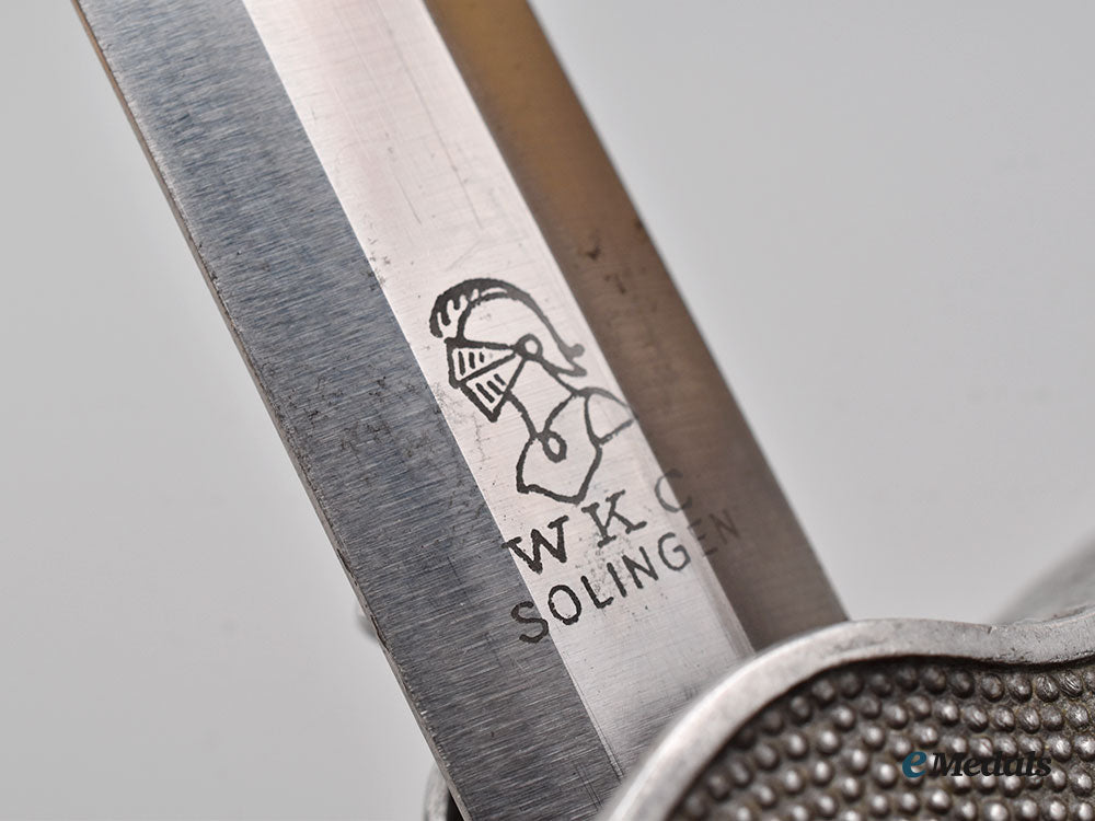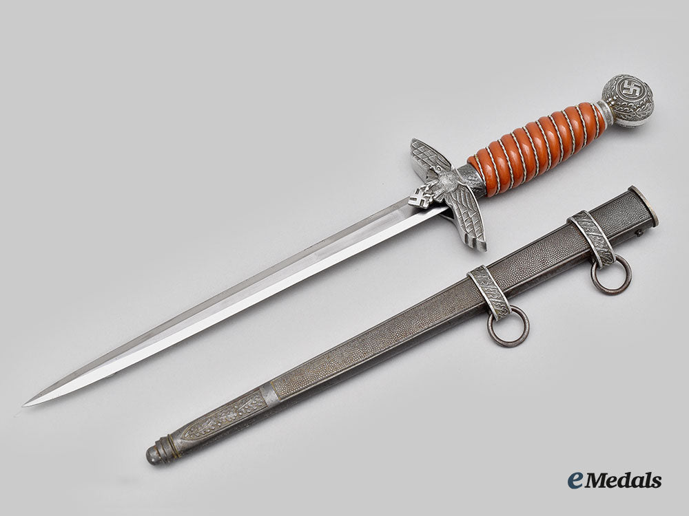 (Luftwaffe Dolch für Offiziere mit Gehänge). A very well-preserved Luftwaffe Officer’s dress dagger, measuring 42.5 cm in total length when inserted into the scabbard. It features a 26.5 cm-long, nickel-plated, magnetic steel blade with a sharpened tip and edges. The blade is maker marked on the reverse ricasso with the logo of Weyersberg, Kirschbaum & Cie, Solingen. It sits securely within an aluminum alloy crossguard, the obverse of which bears a raised Luftwaffe eagle clutching a mobile swastika, with the seam covered by an intact black leather buffer pad. The handle grip consists of a single piece of ribbed brown celluloid, with the ribbon retaining and original twisted and rolled silver wire cord. It completes with a rounded pommel which bears a double-sided wreathed mobile swastika, screwing in to maintain the dagger’s structural integrity. The dagger is accompanied by its original scabbard, constructed of pebbled magnetic metal shaft. The upper third of the shaft has two integral oak leaf bands retaining loops for the accommodation of a hanger. Minor issues consistent with age and wear are evident, and include some running marks to the blade and minor surface oxidation throughout the scabbard. It remains in an overall near extremely fine condition.