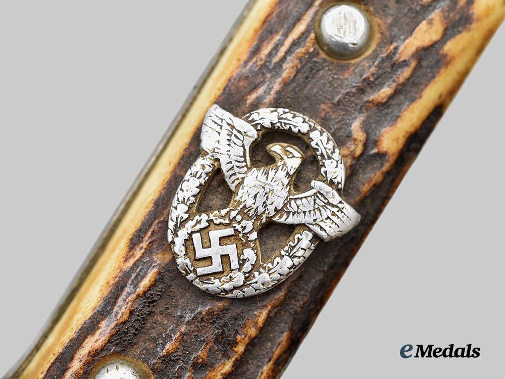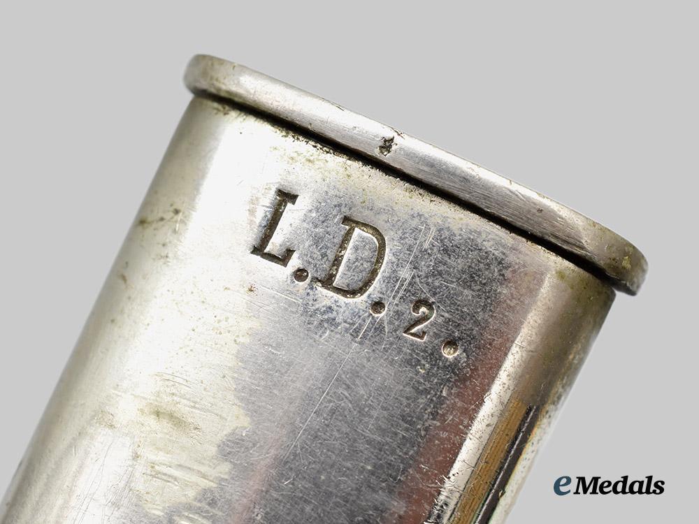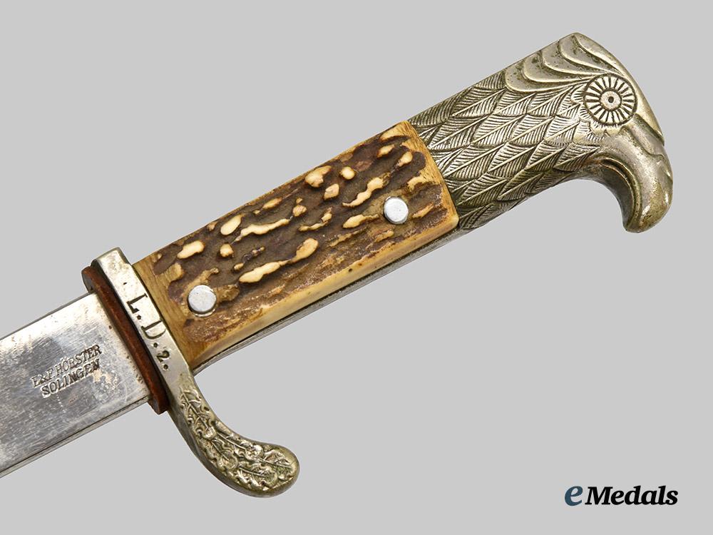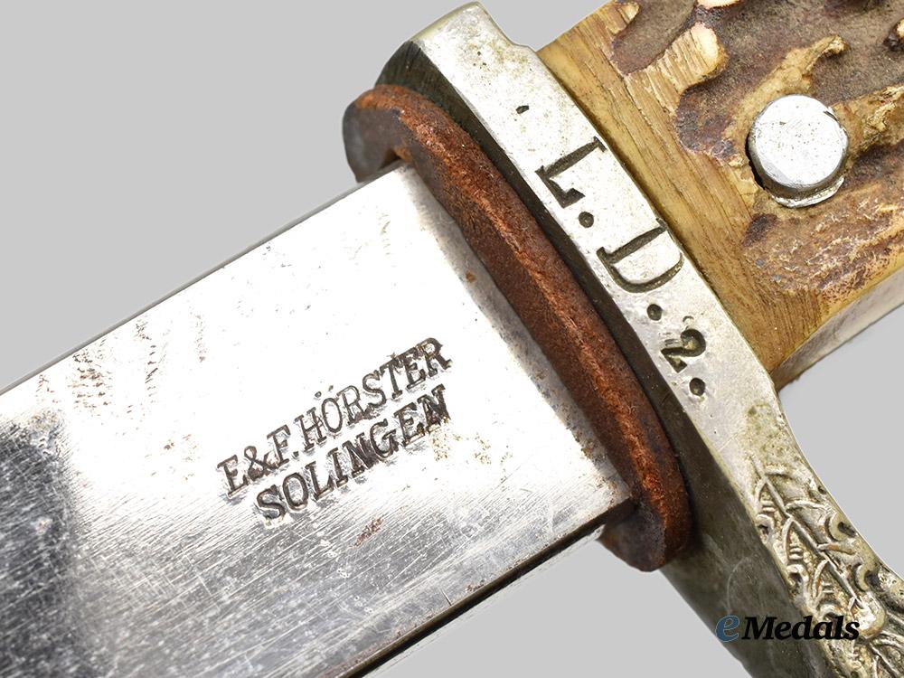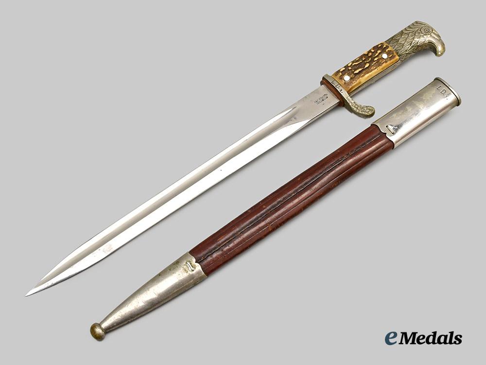 (Extraseitengewehr der Polizei). An extremely well-preserved Ordnungpolizei dress bayonet, measuring 50.5 cm in total length when inserted into the scabbard. It features a 33 mm-long, nickel-plated, magnetic steel blade which retains factory-original sharpening to the tip. A wide fuller runs the majority of the length of the top edge of each side of the blade. The ricasso features a double maker’s mark, with the reverse reading “E. & F. HÖRSTER, SOLINGEN”, while the obverse bears Hörster’s classic monogram logo. The blade sits securely within a multi-piece nickel-plated alloy hilt, with an intact leather buffer pad covering the seam. A hooked quillon is stamped with a unit mark of “L.D. 2.”, while a stylized pommel in the form of a double-sided eagle’s head has a hooked beak to facilitate a comfortable grip. Two pieces of polished staghorn compose the handle, and are fastened in place with aluminum rivets. Inset into the obverse of the handle is a silvered Ordnungspolizei insignia in the form of an oval oak leaf wreath, overlaid by a German national eagle clutching a wreathed mobile swastika, measuring 20 mm (w) x 22 mm (h). Accompanying the bayonet is its original scabbard, constructed of a brown leather shaft, indicating issue to Gendarmerie (rural police). Nickel-plated non-magnetic metal fixtures are riveted to both the tip and throat, with a downward-pointing hook emanating from the latter for the accommodation of a frog. A matching unit mark of “L.D.2.” is also stamped onto the throat, indicating a matching set. Minor issues consistent with age and wear are evident, and include some running marks to the blade, softening of nickel finish to the plated fixtures, and minor fatigue of the scabbard leather. A high-quality example in extremely fine condition.