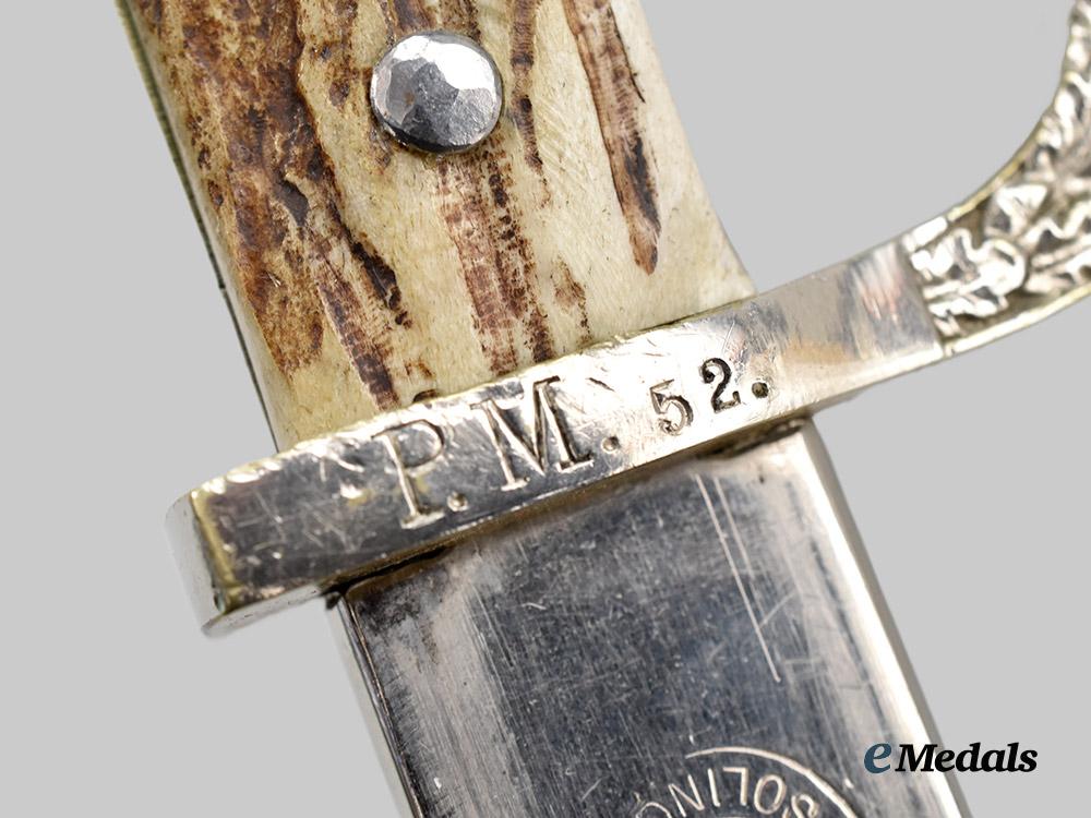 (Ordnungspolizei Seitengewehr für Offiziere). A very well-preserved Ordnungspolizei Officer’s dress bayonet, measuring 48 cm in total length when inserted into the scabbard. It features a 33 cm-long, nickel-plated, magnetic steel blade which retains factory-original sharpening to both the tip and lower edge. A wide fuller runs the majority of the length of each side of the blade. The reverse ricasso bears a maker’s mark of “CARL EICKHORN, SOLINGEN”, circumscribing the firm’s classic squirrel logo. It sits securely within a multi-piece hilt featuring a nickel silver crossguard, adorned with raised oak leaves, and pommel which takes the form of a double-sided eagle’s head. Two pieces of polished staghorn compose the handle grip, and are fixed in position with dual magnetic metal rivets. The reverse of the crossguard bears a unit mark of “P.M. 52.”, while the blade’s spine is stamped with an acceptance mark. Accompanying the bayonet is its original scabbard, constructed of a blackened leather shaft. Nickel silver fixtures are affixed to both the tip and throat, with a downward-pointing hook emanating from the latter for the accommodation of a frog. The former is included, and consists of multiple panels of blackened leather stitched and riveted into a loop for belt suspension. Stamped onto the reverse of the throat fixture is a unit code of “P.M. 52.”, indicating a matching set. A functional catch situated within the throat firmly holds the bayonet in place during storage. Minor issues consistent with age and wear are evident, and include some running marks to the blade and scratching of the nickel silver elements. This complete set remains in an overall extremely fine condition.