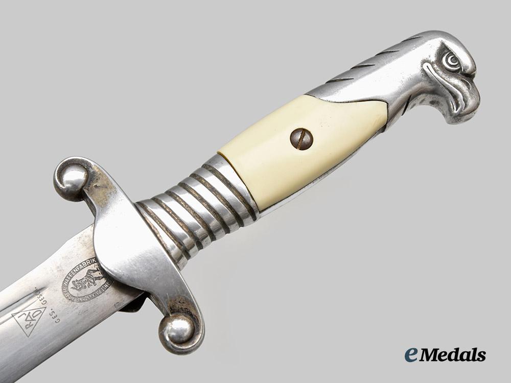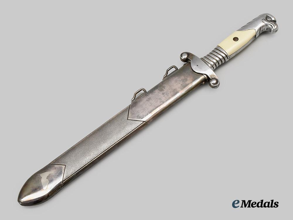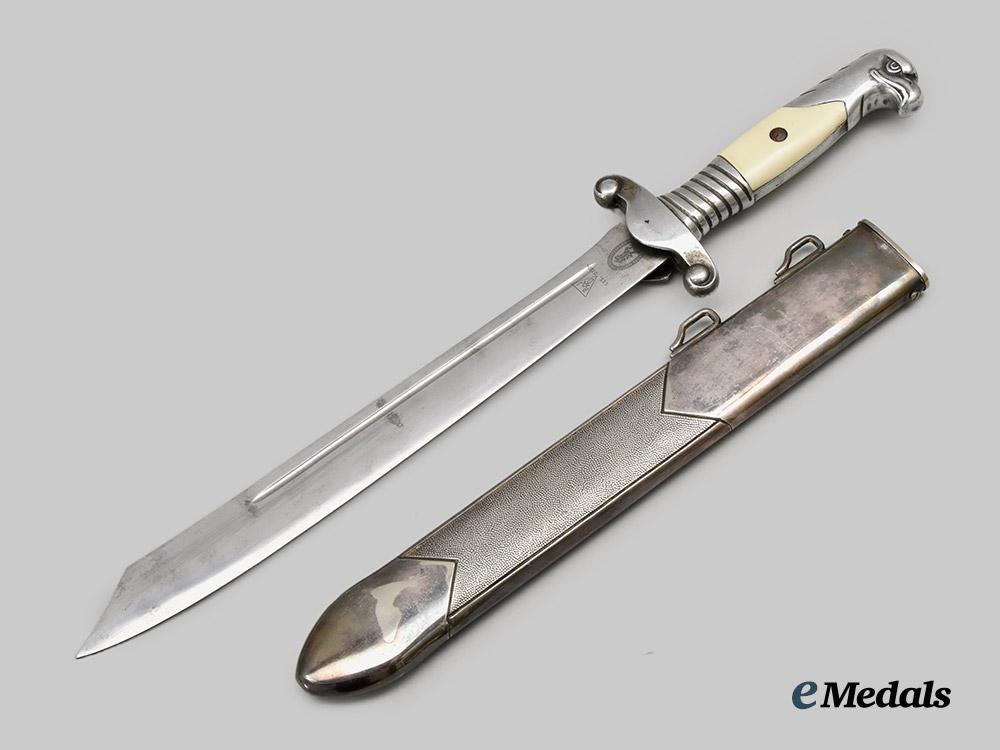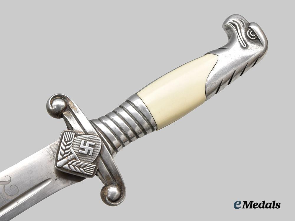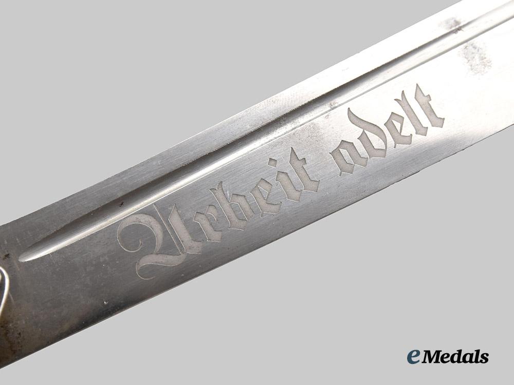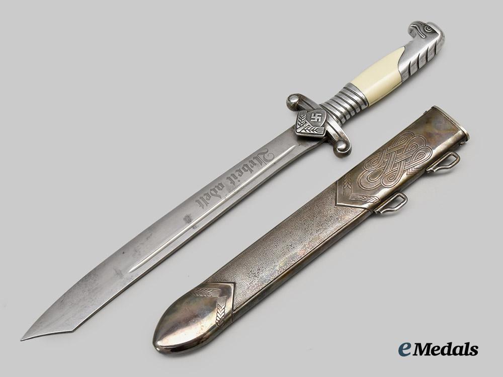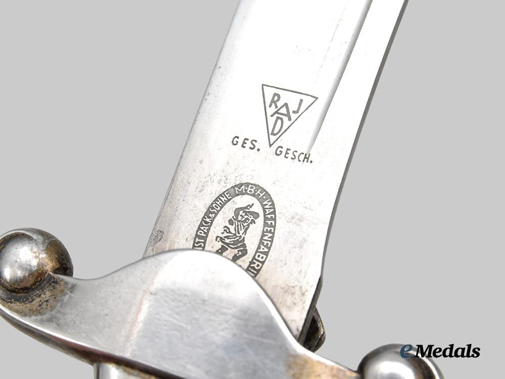 (Reichsarbeitsdienst Hauer für Führer). An extremely well-preserved Reichsarbeitsdienst (Reich Labour Service/RAD) Leader’s Hewer, measuring 40 cm in total length when inserted into the scabbard. It features a 27 cm-long, nickel-plated, bolo-style, magnetic steel blade which retains factory-original sharpening to the tip and lower edge. A narrow fuller runs the majority of the length of the top edge of each side of the blade. Acid-etched onto the obverse is an inscription of “ARBEIT ADELT” (“LABOUR ENNOBLES”) in Fraktur script. The reverse ricasso bears a maker’s mark of “ERNST PACK & SÖHNE, SOLINGEN”, circumscribing the firm’s classic Siegfried logo. Situated above the maker’s mark is an additional Reichsleitung des Reichsarbeitsdienstes (RLAD) logo. The blade sits securely within a nickel-plated alloy hilt with the obverse crossguard bearing a raised RAD logo, and which culminates in a pommel in the form of a double-sided eagle’s head. Two pieces of off-white celluloid compose the handle grip, and are held in place with a single magnetic metal rivet. Accompanying the hewer is its original scabbard, constructed of a nickel-plated magnetic metal shaft. A pebbled centre is flanked on the obverse by wheat stalks, and at the upper third with ribbed and knotted latticework. Two integral loops emanating from the side of the shaft accommodate a hanger. A functional spring catch situated within the throat firmly holds the hewer in place during storage. Demonstrating only minor running marks to the blade and sporadic wear to the nickel of the plated features, this high-quality example remains in an extremely fine condition.