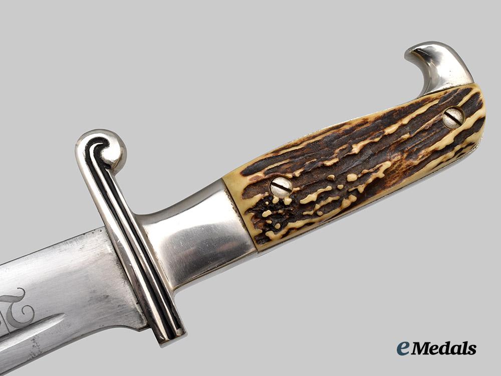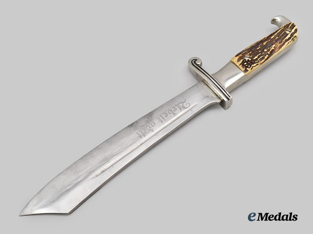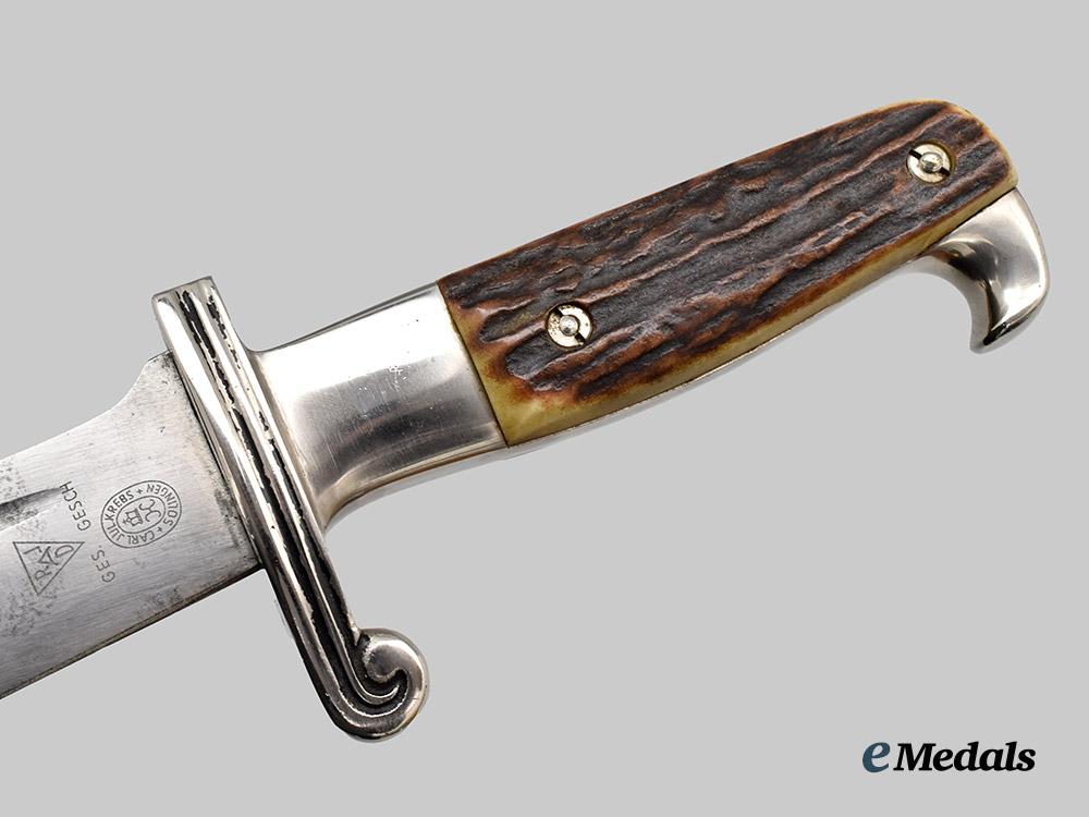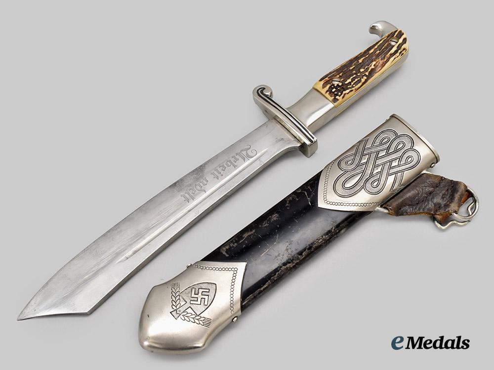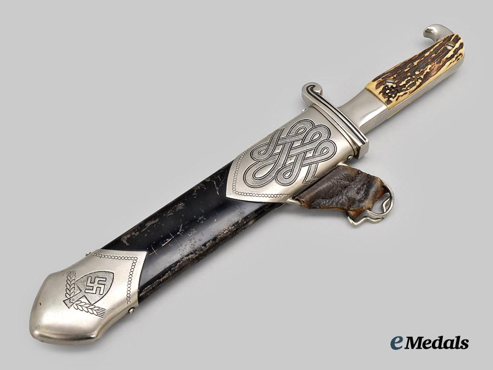 (Reichsarbeitsdienst Hauer für Mannschaften und Unterführer). A well-preserved Reichsarbeitsdienst (Reich Labour Service/RAD) Model 1934 EM/NCO’s Hewer, measuring 39.5 cm in total length when inserted into the scabbard. It features a 25.5 cm-long, nickel-plated, Bowie-style, magnetic steel blade with a gentle curvature. The obverse bears an acid-etched inscription of “ARBEIT ADELT” (“LABOUR ENNOBLES”) in Fraktur script. The reverse ricasso bears a maker’s mark of “CARL JUL. KREBS, SOLINGEN”, circumscribing the firm’s monogram logo, in turn topped by a Reichsleitung des Reichsarbeitsdienstes (RLAD) insignia. The blade sits securely within a nickel-plated magnetic metal hilt with a ribbed crossguard, and with a hooked quillon and pommel. Two pieces of polished staghorn compose the handle grip, and are fastened in position with dual non-magnetic metal rivets. Accompanying the Hewer is its original scabbard, constructed of a black painted magnetic metal shaft. Nickel-plated magnetic fixtures are secured to both the tip and throat, with the former bearing double-sided RAD insignia and the latter featuring a ribbed trefoil design. A loop emanating from the side of the throat fixture accommodates a replacement hanger constructed of blackened leather with metal fixtures. A catch situated within the throat holds the Hewer in place during storage. Minor issues consistent with age and wear are evident, and include faint running marks to the blade, moderate loss of scabbard paint, and fatigue to the substitute hanger. It remains in an overall near extremely fine condition.